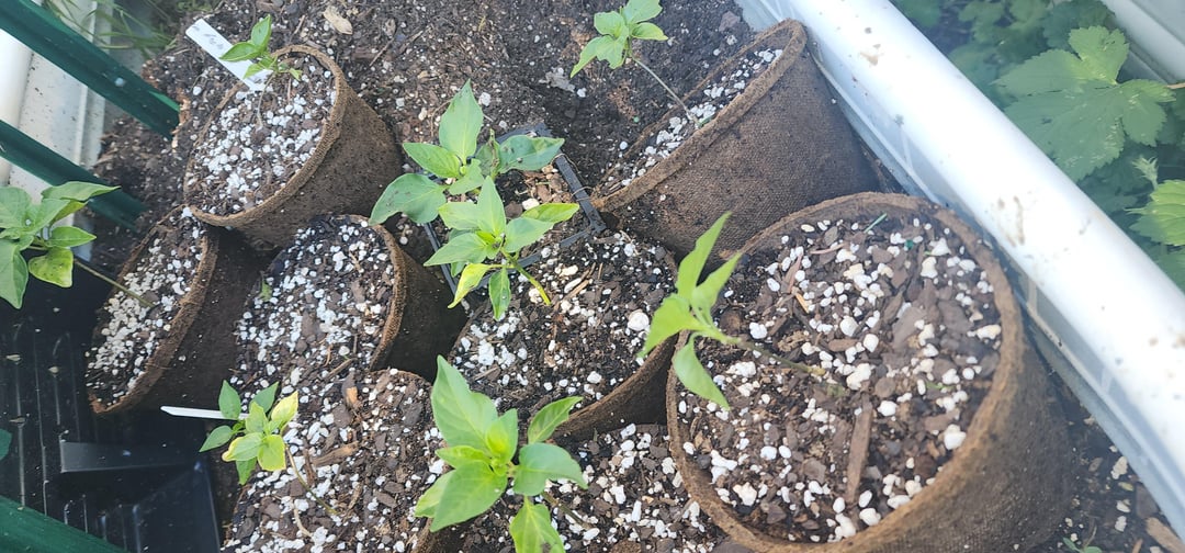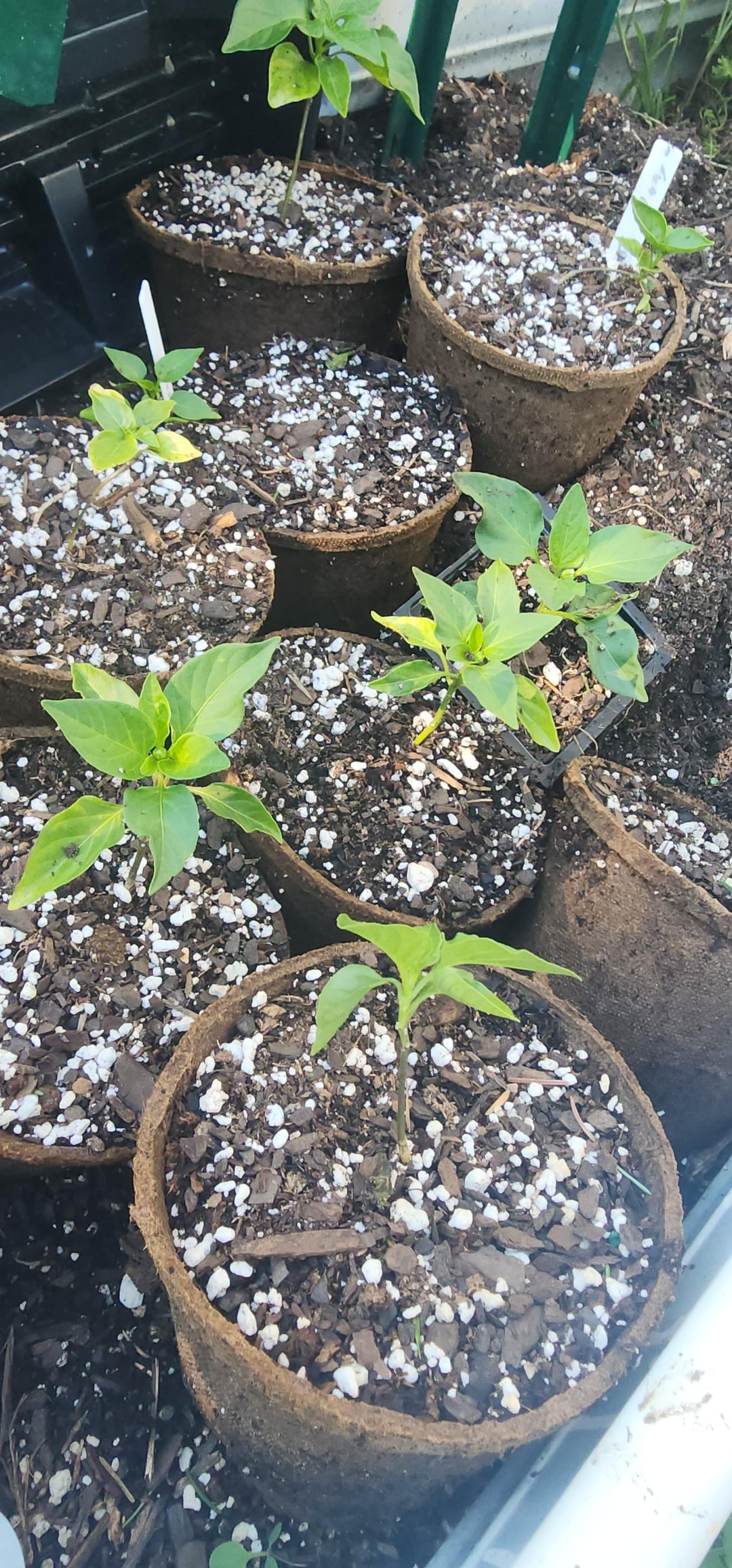 Grew all of these from seed…they've taken forever to get to this point. Transplanted from a seedling cells to these larger "biodegradable" pots about a month ago.