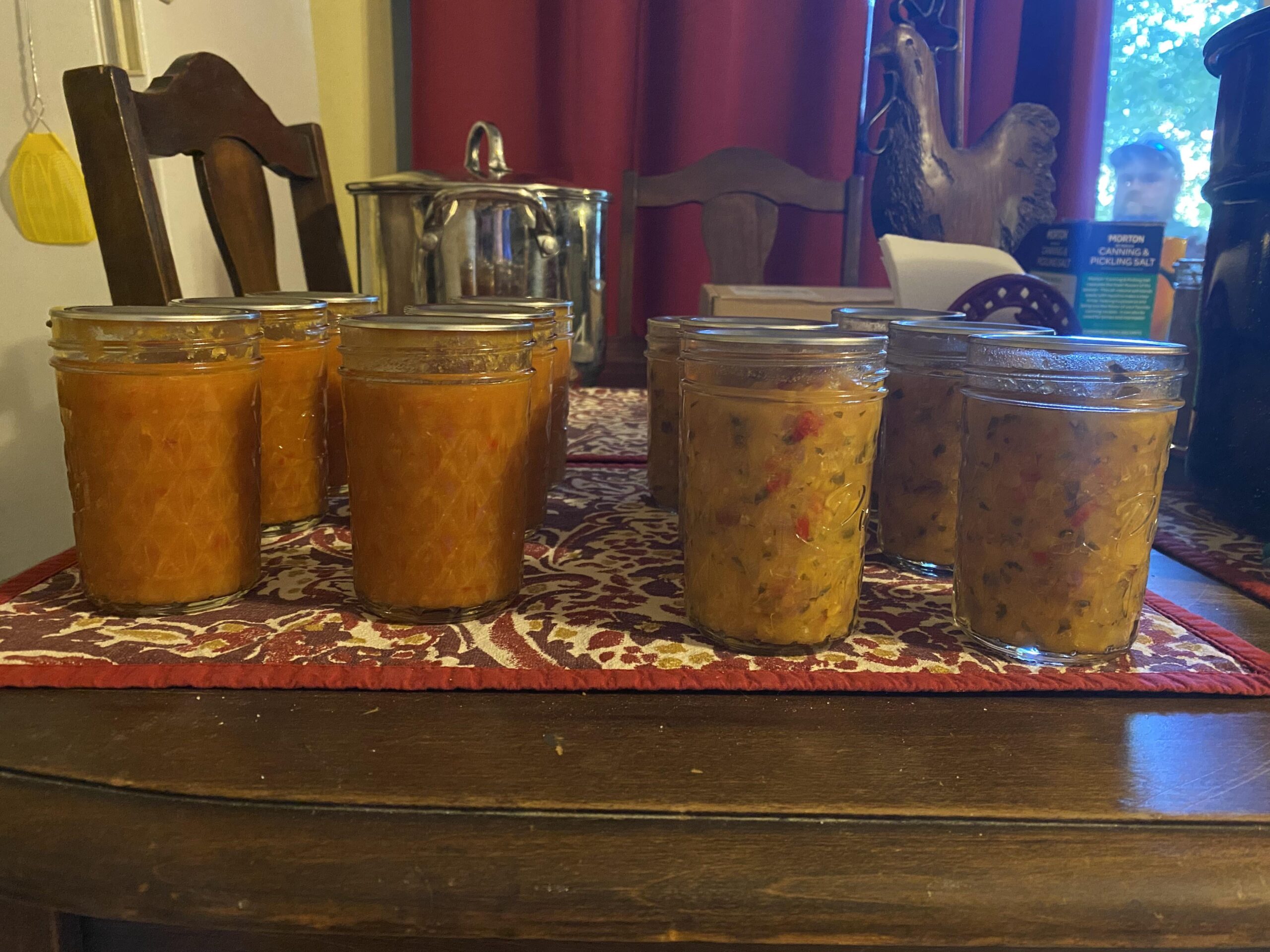 You make the Ball Zesty Peach BBQ sauce (left) and Peach Salsa (right). I’ve also canned what feels like GALLONS of peach slices and peach butter. Our tree produced a bounty this year!