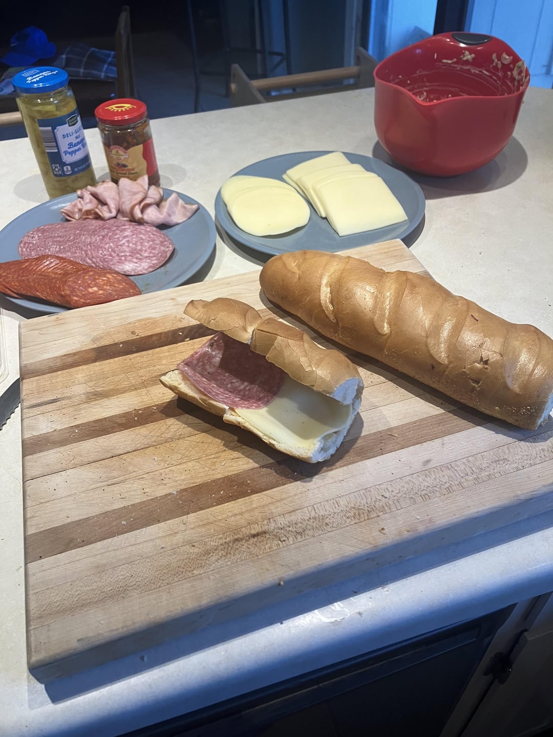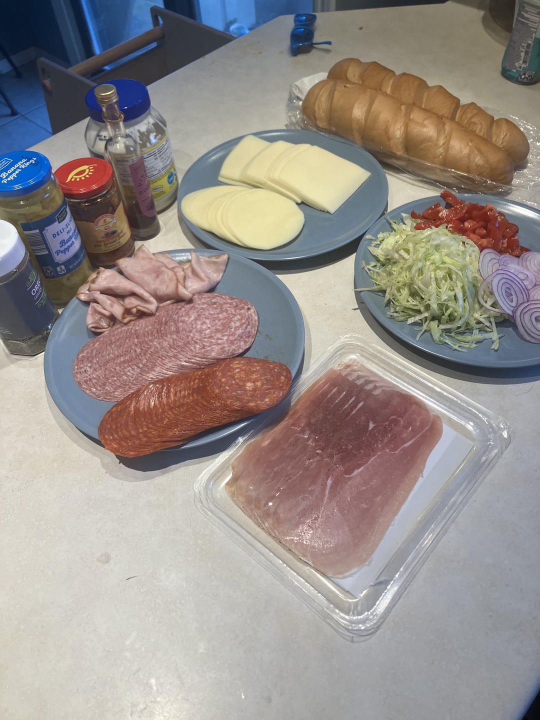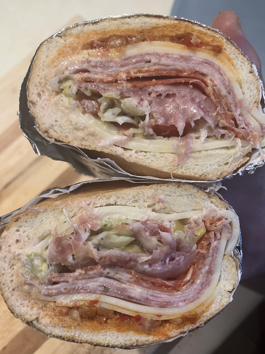 Italian with provolone,salami, ham, pepperoni, prosciutto, banana peppers, Calabrian chili spread, mozz, and a salad of lettuce, tomato, onion,basil, oregano, mayo, red wine vinegar, salt and pepper. Photos in reverse order.