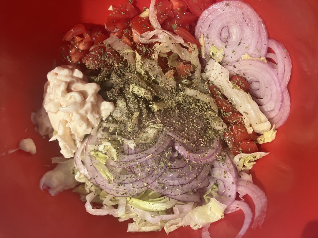 I like the chopped/mixed veg approach. did you mayo/salt/pepper/vinegar/oregano the veg and that was how you applied that stuff to the sandwich, too? kinda genius imo if so… and that’s what it looks like from the pics