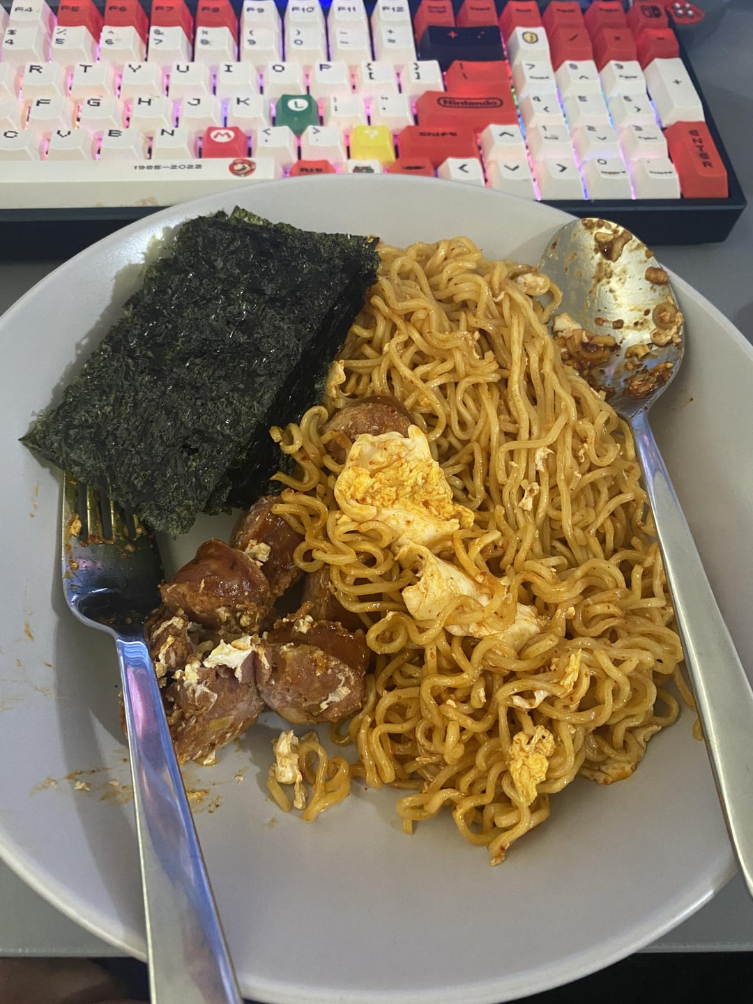 Hot&Spicy Indomie Goreng was on sale at my local 99 Ranch Market. Cooked with egg. Added some mayo to add a bit of creamy taste. Aidells Cajun Style Andoulille and nori as sides. Not as spicy as we got back home in Indonesia, but still great.