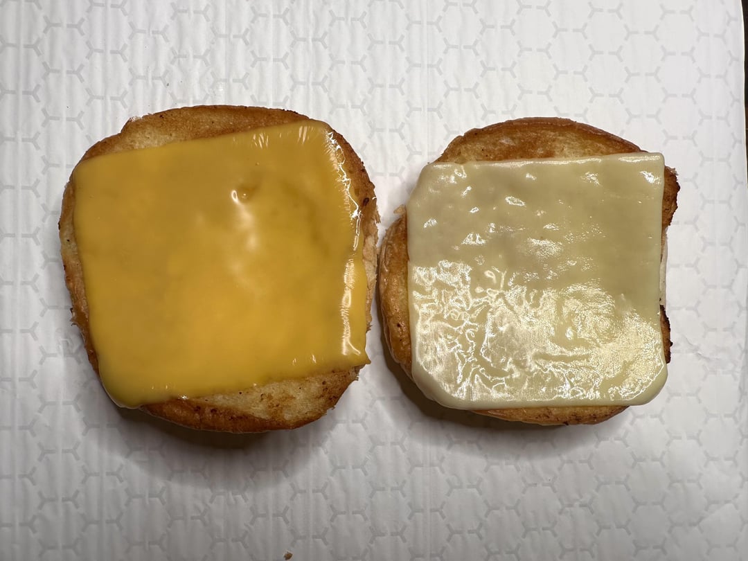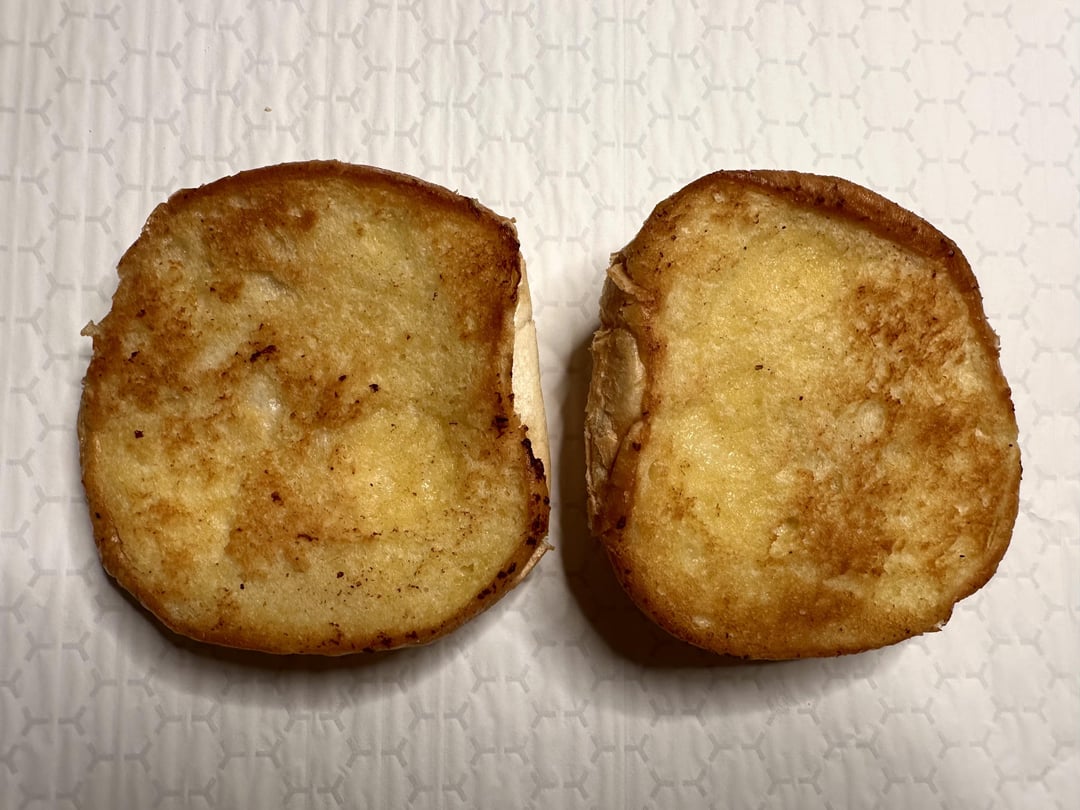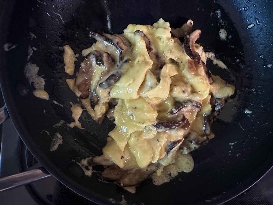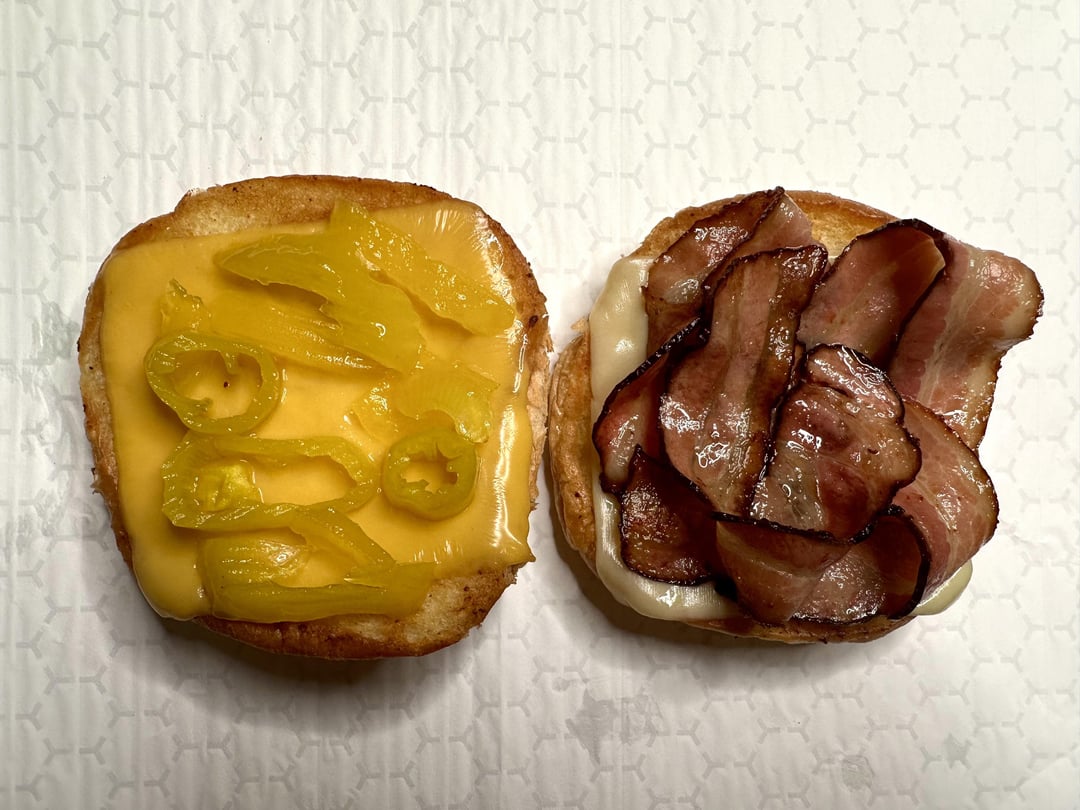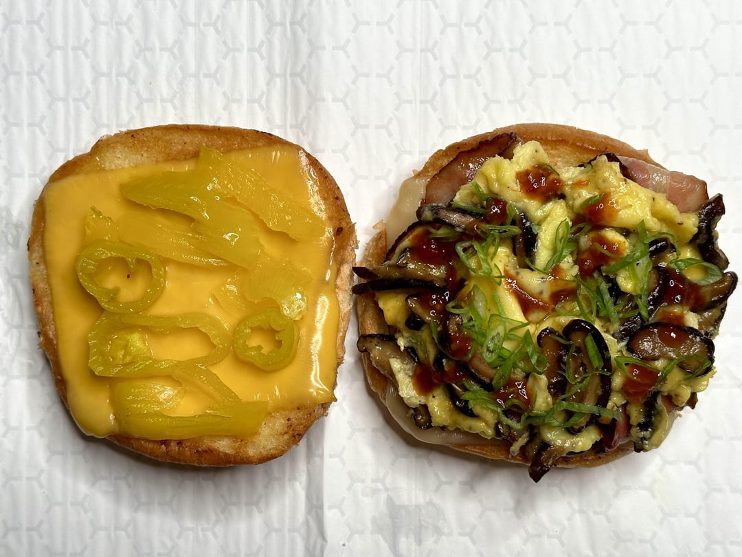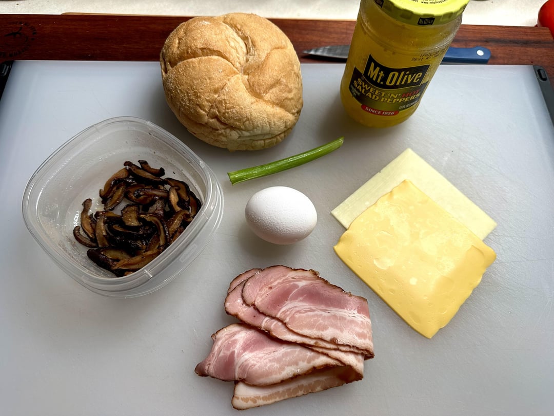 Soft scrambled egg with sautéed shiitake mushrooms, pan-fried double-smoked Polish Hunter’s bacon (like a cross between bacon and ham), American and Havarti cheese, scallions, sweet and hot banana peppers, and some hot sauce, on a buttered and griddled Kaiser roll.