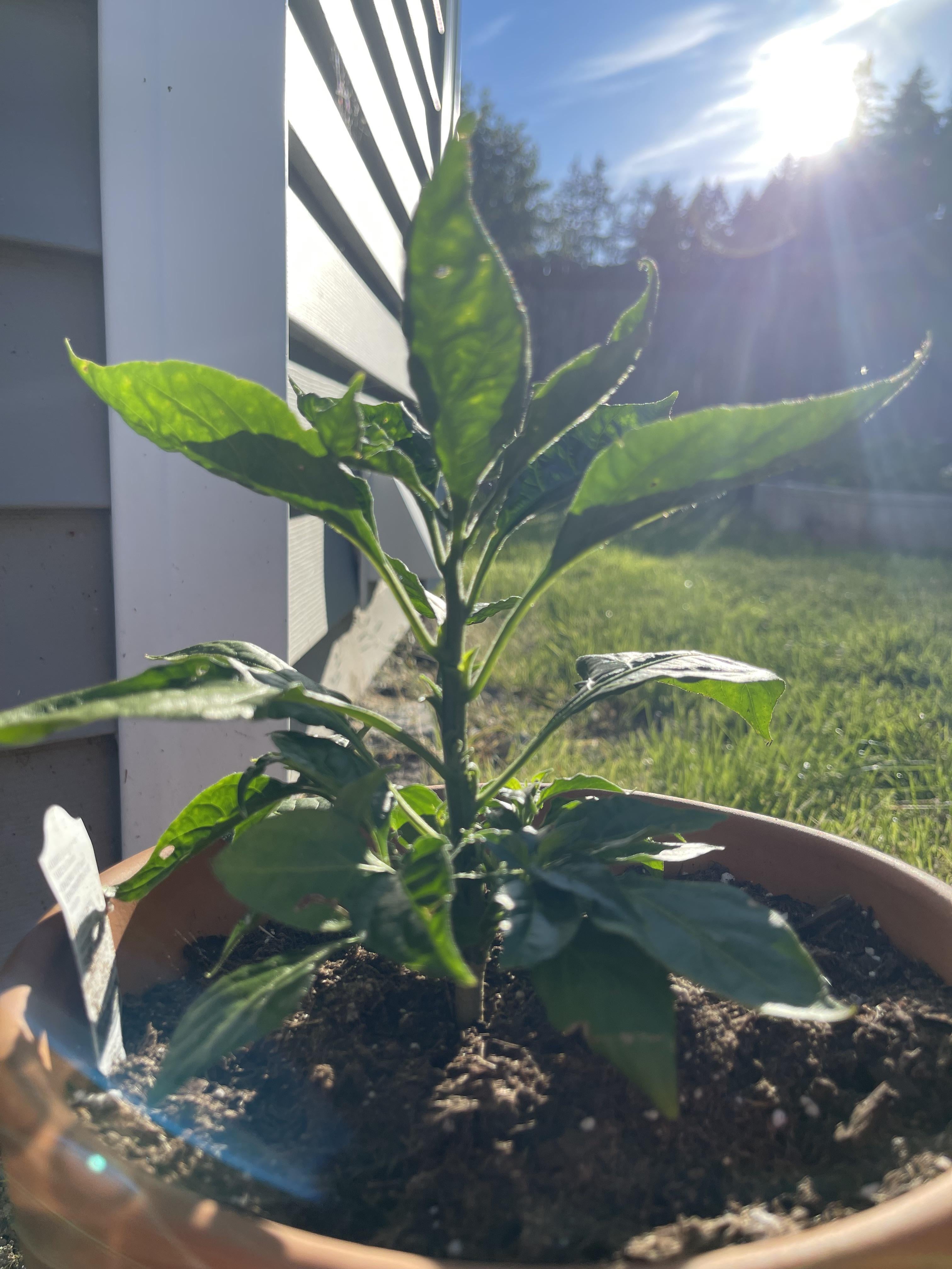 First time pepper grower here! Located in the PNW. I bought this habanero plant from Lowe’s about a month ago. I repotted it in a clay pot with drainage using potting soil. It gets sun all day, 70-80 degree days, and watering when the soil is no longer moist two knuckles down. It hasn’t grown at all and hasn’t attempted to flower. As you can see, it’s also not dying. I bought a jalapeño plant from the store as well and I’m already seeing multiple flowers and peppers coming in. What are some issues that may be going on here? I’ve looked online and I’ve seen that too much nitrogen could be the culprit. I’m also wondering if there’s too many leaves and it’s focusing too much on keeping them alive? Any help would be appreciated!