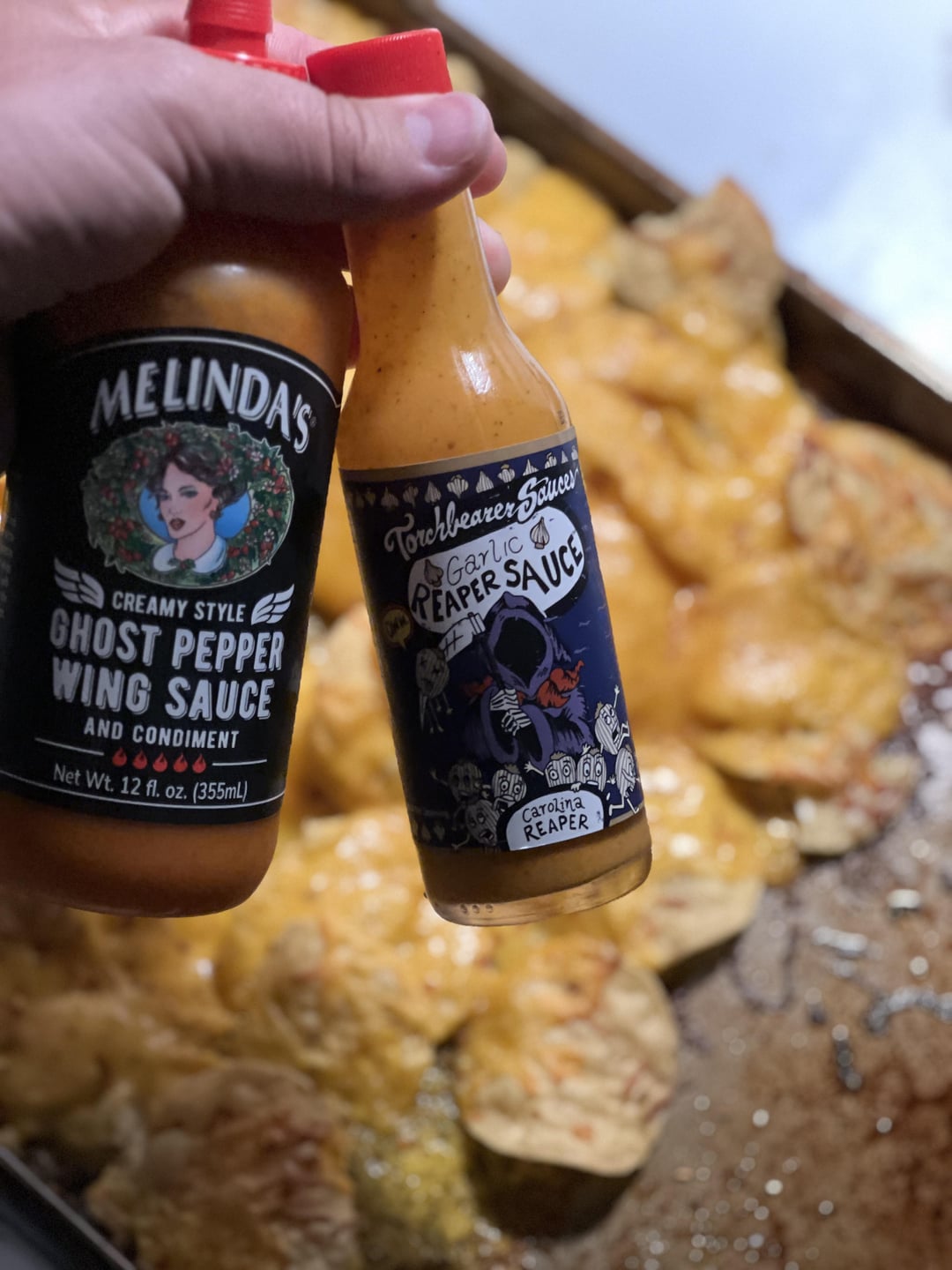 Cheese nachos made with Mexican, cheddar, and Carolina Reaper cheddar. Melted in oven at 350 for 5 min, then sprinkled some Ghost Pepper flakes. Alternated bites with Melinda’s Ghost Pepper and Torchbearer’s Garlic Reaper. Still alive this morning…