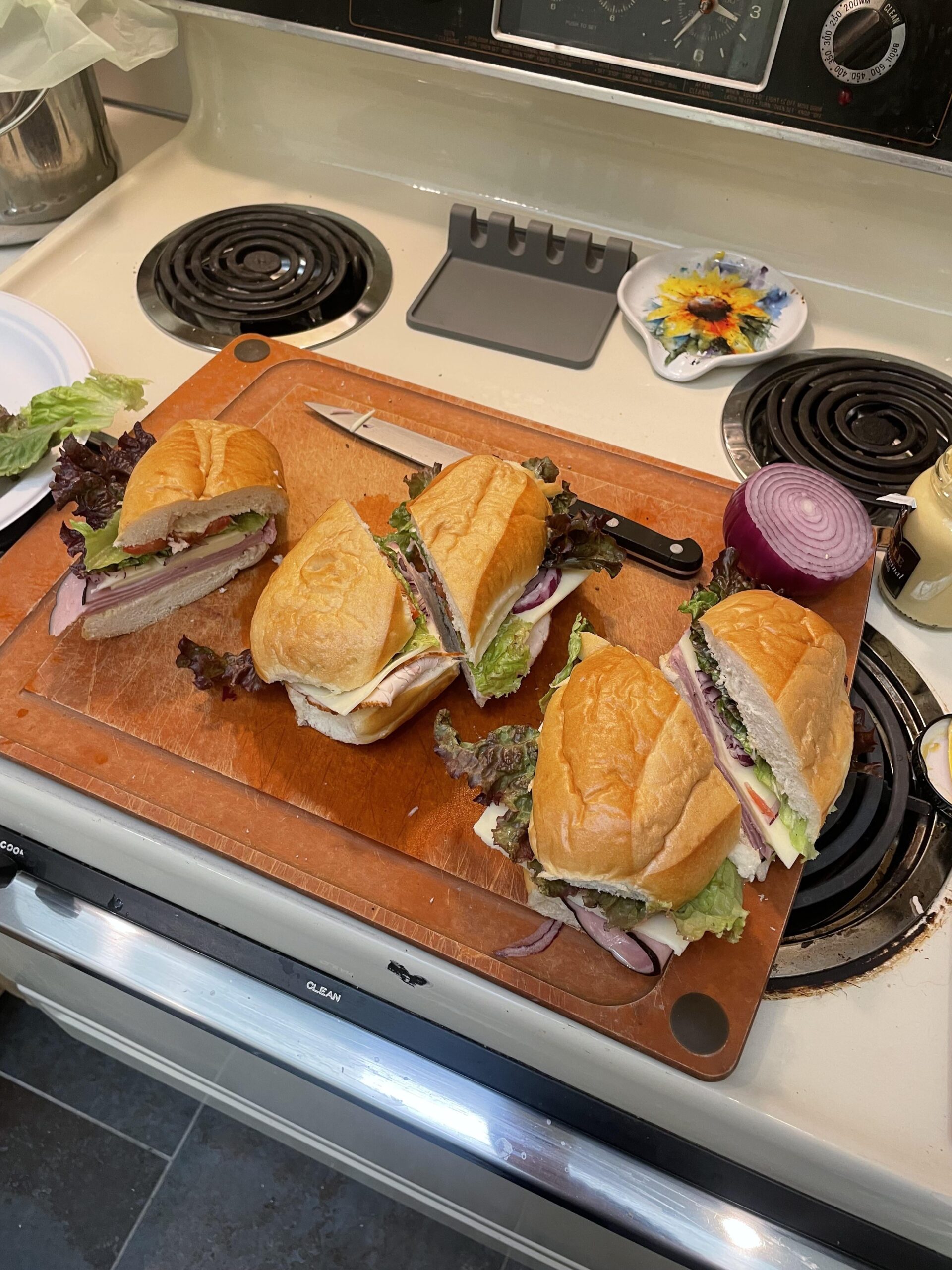Grocery store bread, ham, cheese and the works. Fammiches are the best