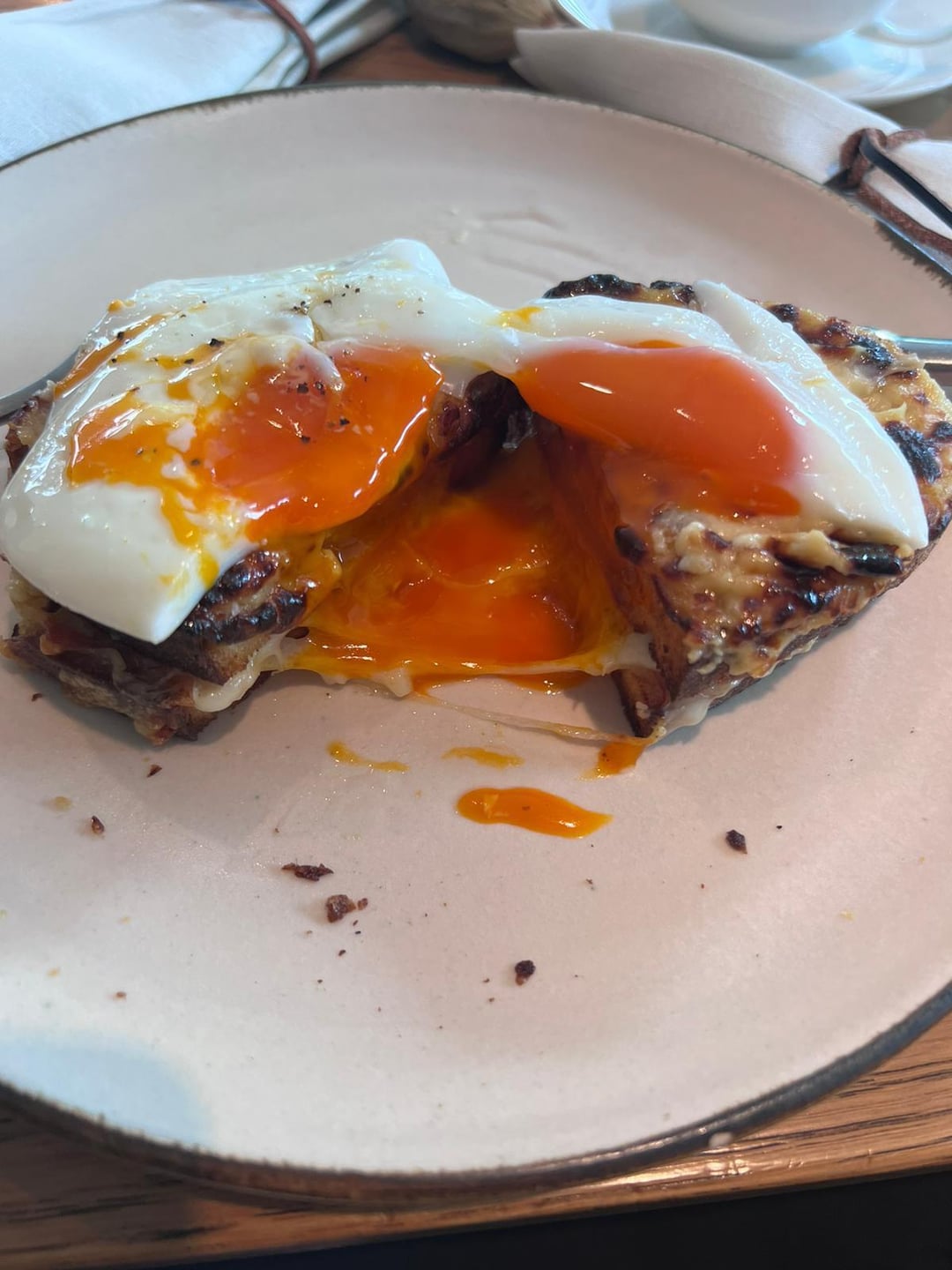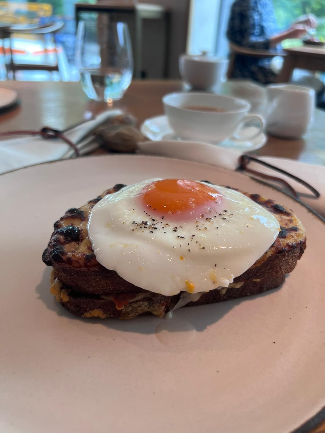 Yikes! Croque monsieur is a mess. The egg is undercooked and the bread is burnt