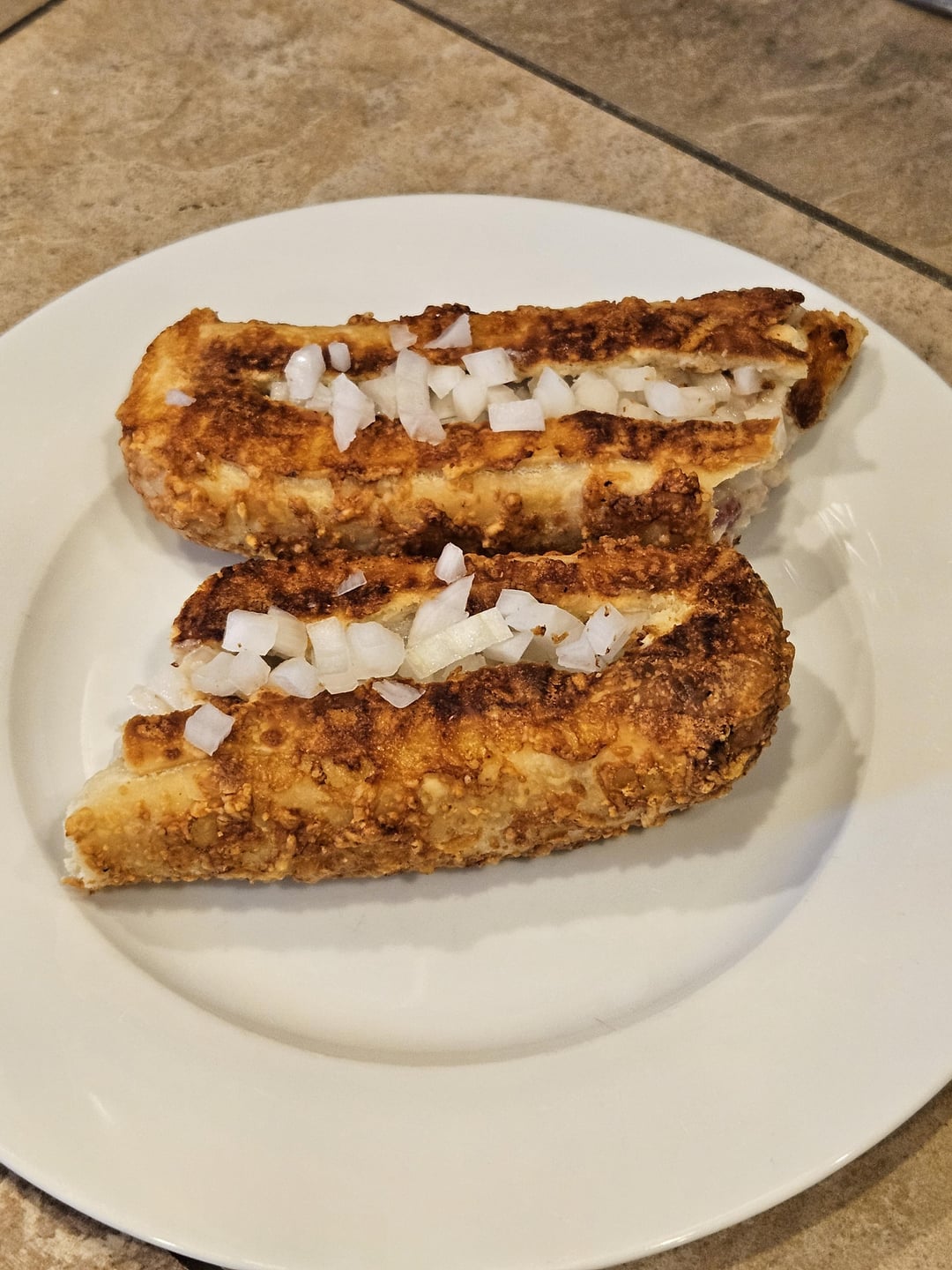 My Costco doesn't offer onions so I dice them at home. Seasoned with black and red peppers and garlic & ginger powders. It's absolutely packed, used a spoon to press them in. 😌