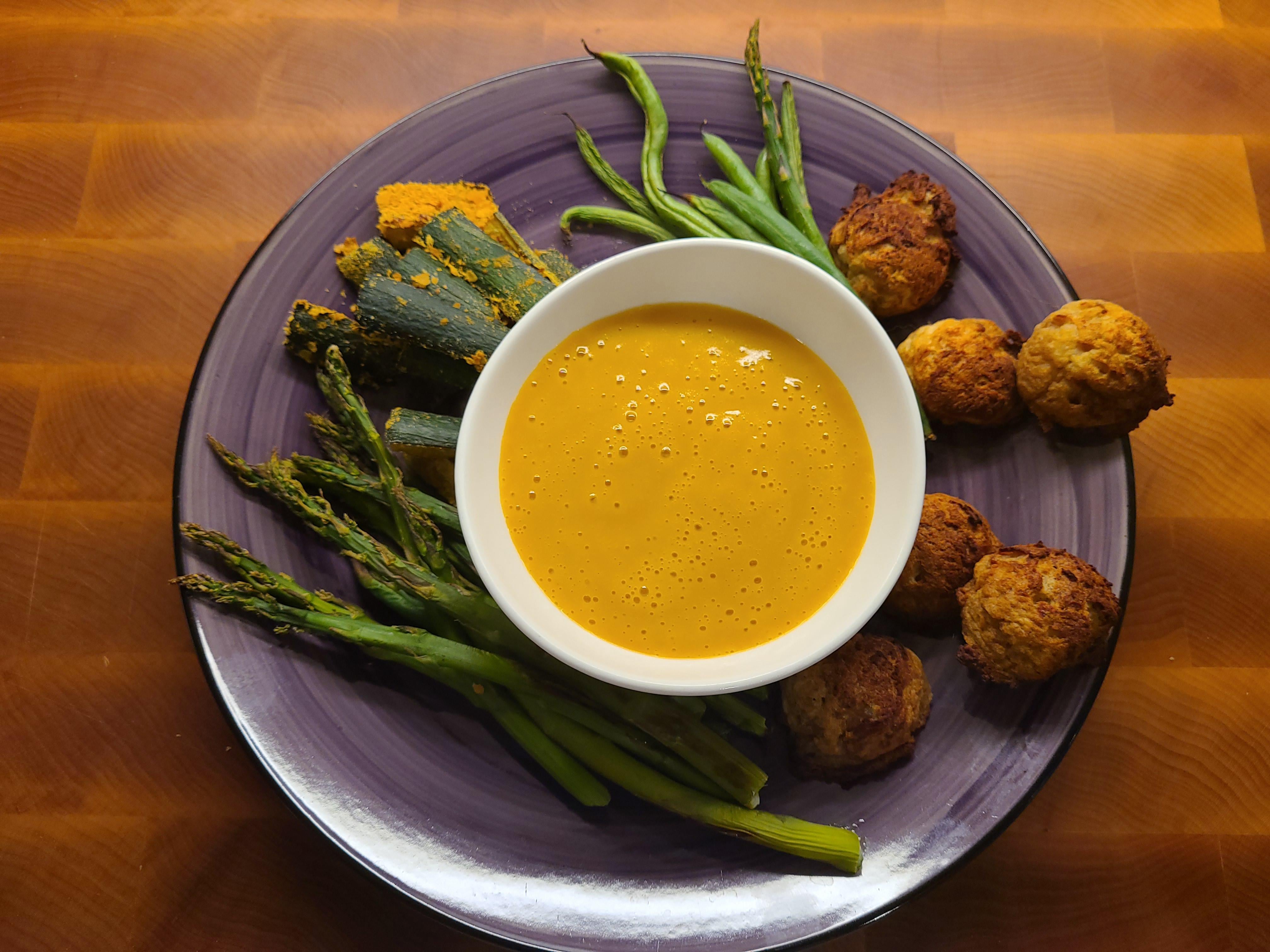 For food tax, a pic tonight's dinner of mashed potato balls, nooch-crusted zucchini, roasted asparagus and green beans, and WFPB cheesy sauce. There was a big green salad, too, but I didn't bother with a picture of that.