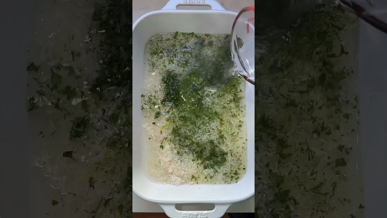 I don’t know about you, but one pot meals give me life. Especially one pot meals that involve rice. So here’s what you’re going to do. You’re going to grab all the leftover herbs that are in your fridge and chop them up. Put them on top of some rice and a casserole dish add salt pepper water and lots of lemon zest. Give it a really good stir. Next we’re going to make a quick marinade with olive oil, a little more herbs honey, salt, garlic. Place a really beautiful piece fillet of salmon on top. Brush the marinade on. Cover it really tightly with foil and bake until tender and flaky.