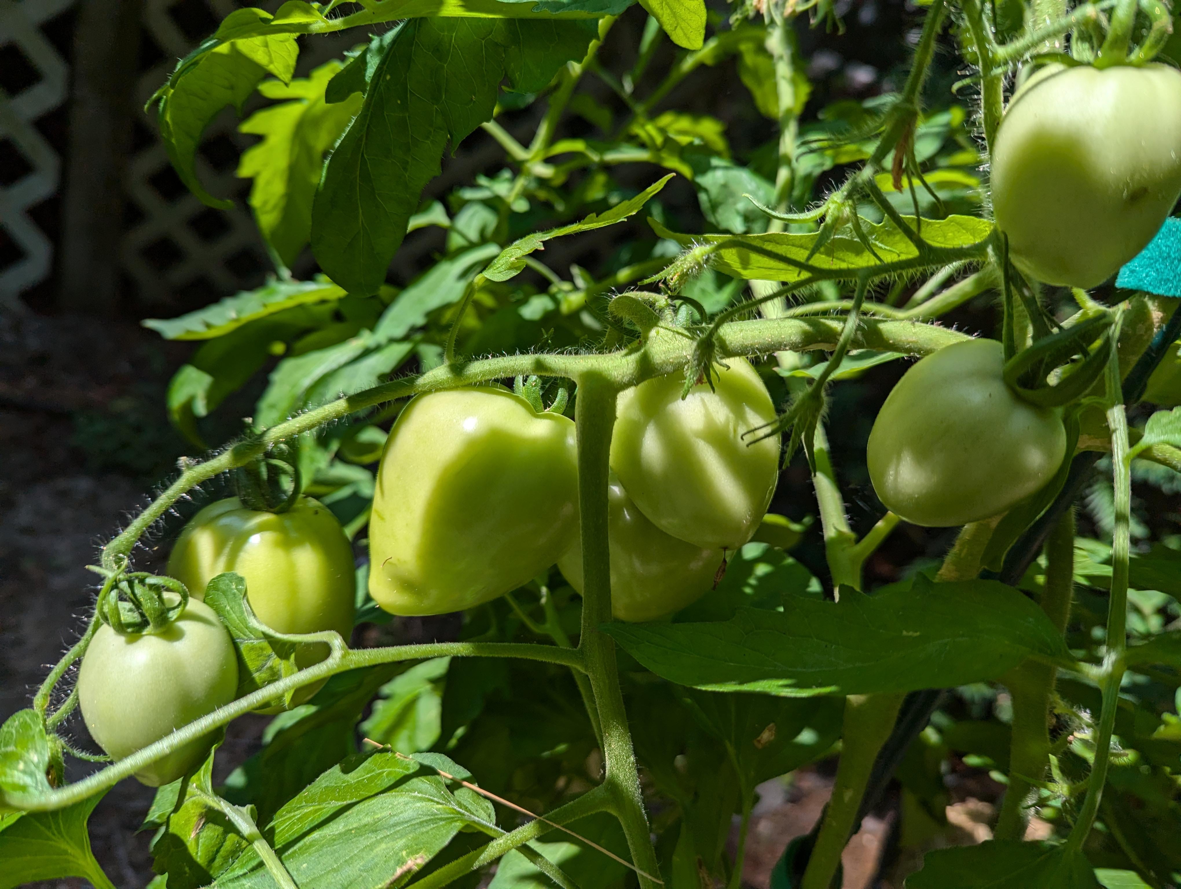 Mine are all green. I will take a pic soon. Anyone have a hybrid suggestion? I only have grown heirloom and want to try something new. I did cherries this year and I almost never do so next year a good hybrid or two would work. 🙂 My healthy one this year is Black Krim and Anais Noir.