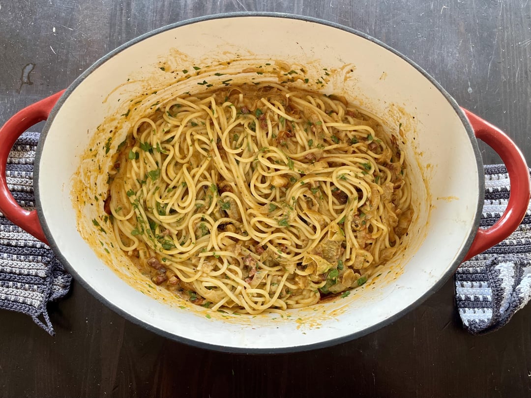 Based on a recipe I saw in a video here on Reddit. With two changes, bacon instead of dried tomatoes and cream instead of coconut milk. First time I used a video like this as a recipe and it turned out very good.