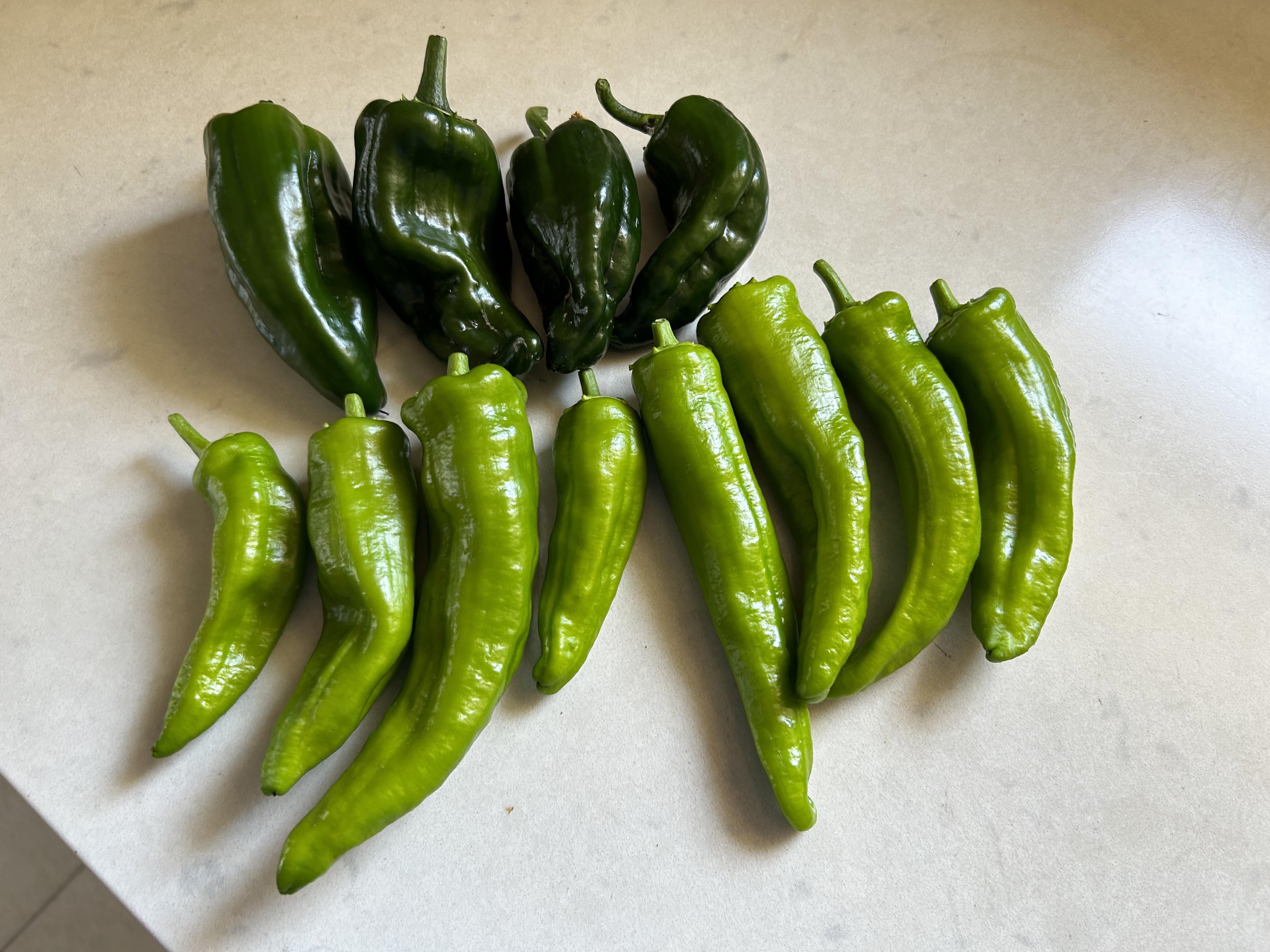 The top ones are poblanos, the bottom ones look like Anaheim or hatch.