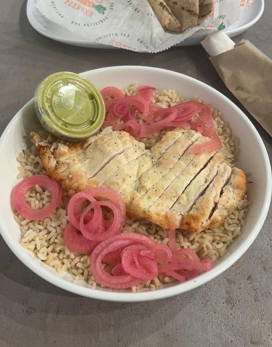 It’s a plain chicken breast (no breading) with brown rice. I added red onion and the calories on the menu are not counting that and the sauce. I’m just curious cause it seemed like it was a lot of rice and it was rlly filling for 471 cals.