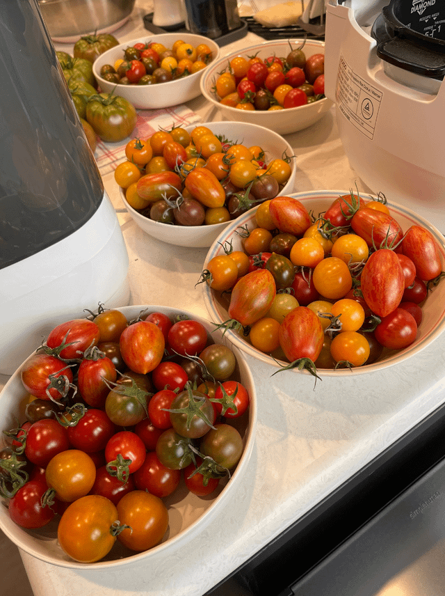 I like to put a bunch in a big dutch oven (big tomatoes and cherries alike) and cook them down into sauce. I use the food mill attachment on my mixer to remove the seeds and skins, then cook it down into sauce, ketchup, bbq sauce, etc. – seedless/skinless sauce is a great base for all the summer projects and the cherry tomatoes give it such a bright note.