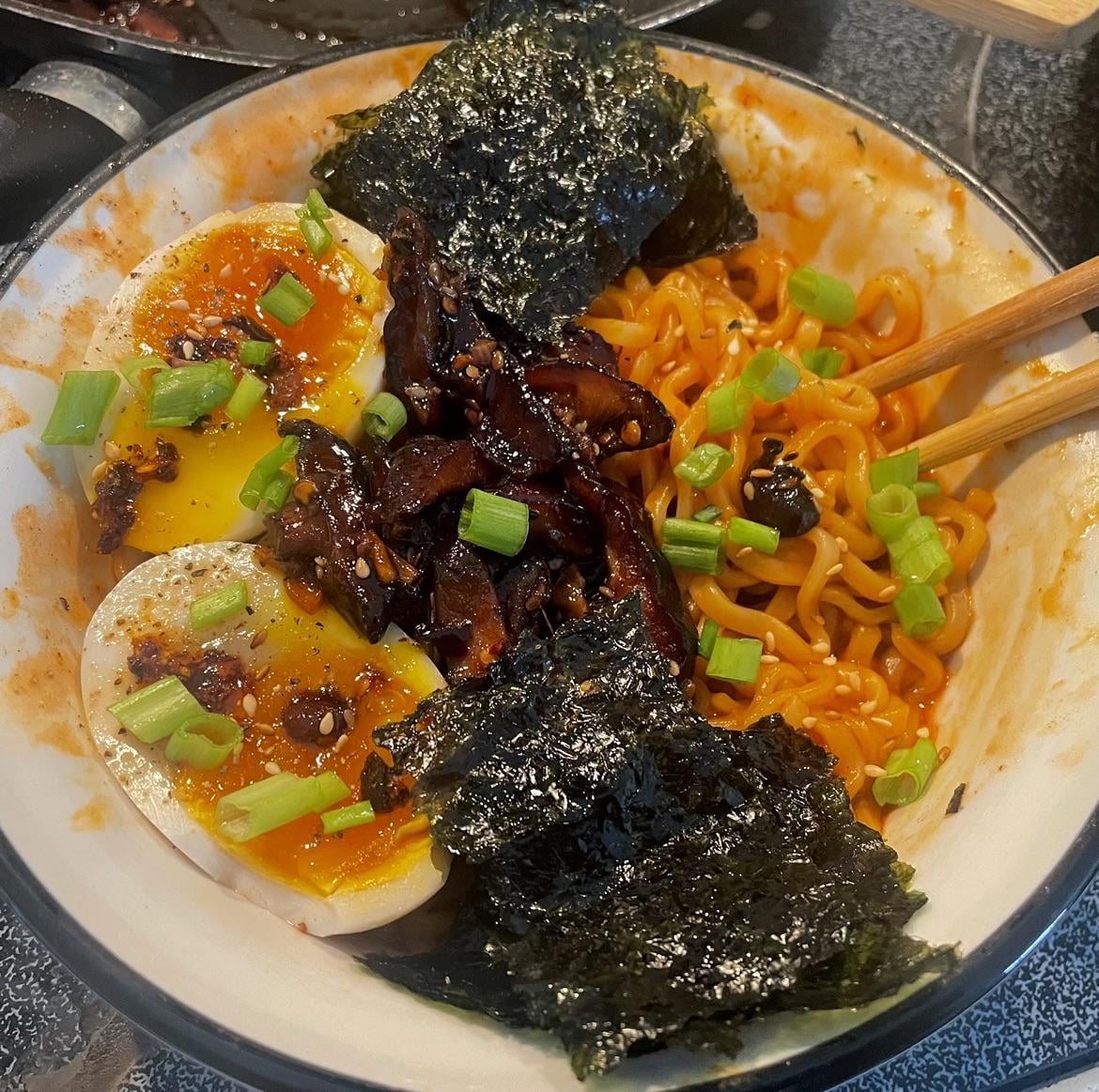 Topped it with seaweed, green onion, a soft boiled duck egg, and shiitake mushrooms sautéed in garlic, ginger, chili oil, soy sauce, mirin, rice vinegar, a bit of sugar, and sesame oil.