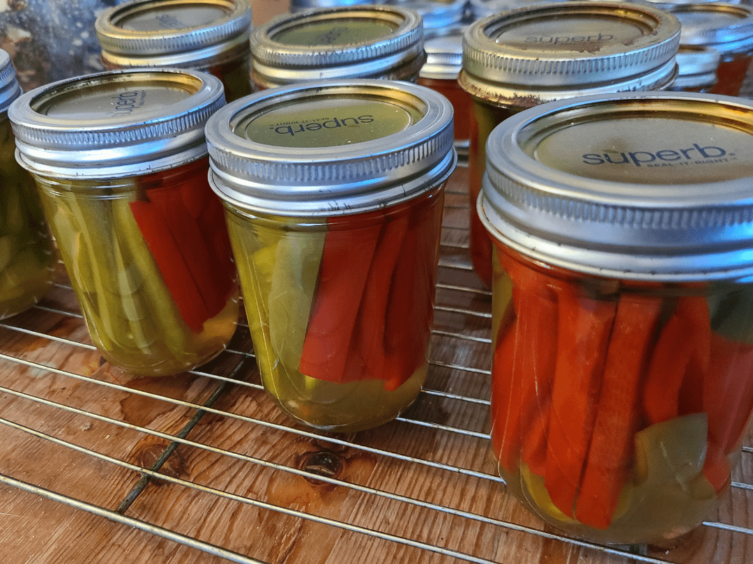 Pickled Peppers- This is a combo of red and green capsicum and jalapeños. This is using a hot pickled pepper recipe and I'm unsure how it'll turn out.