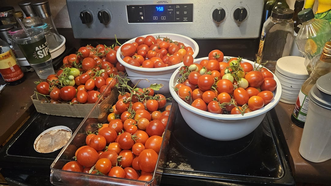 Bonus pics at the end of 7 jars of bruschetta topping made this morning, and just some of the tomatoes I started with.