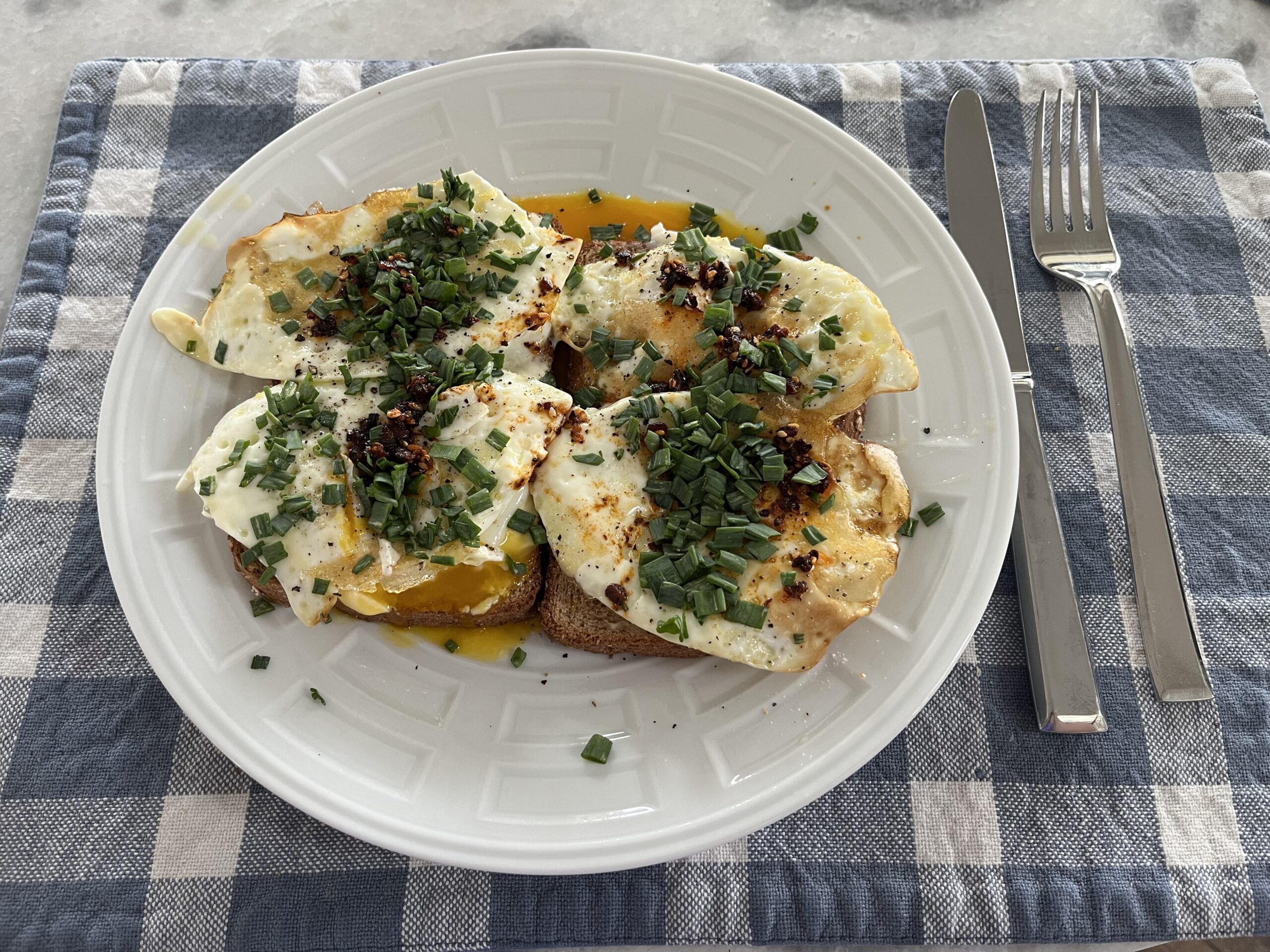 Local farm eggs over easy on whole wheat toast with chili crunch, fresh scallions and a touch of Duke’s mayo by slimb0 Write A CommentYou must be logged in to post a comment.