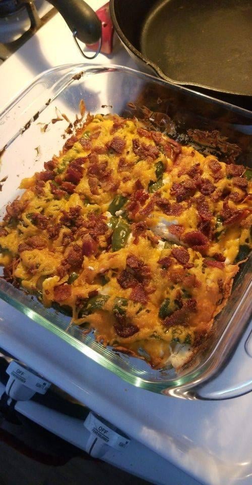 1. Layer chicken, cream cheese, jalapenos, seasonings, cheddar, and bacon. 2. Cook at 375 for 35 min. (30 min would have been fine… maybe even less, since the chicken is already cooked)