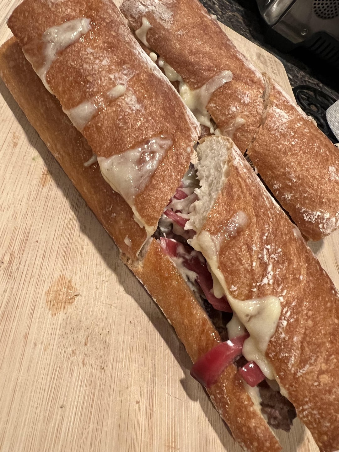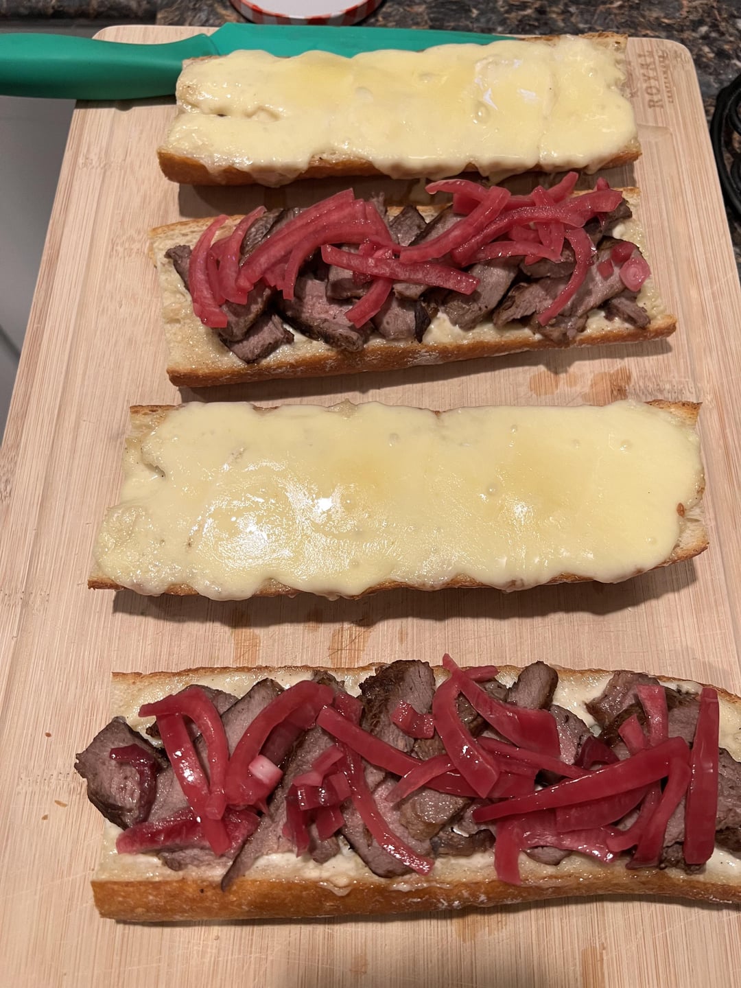Bought the ciabatta from Panera to get it as close as possible. Seared ribeyes, aged white cheddar, pickled red onions, and horseradish mayo. Toasted open faced and then assembled. Delicious!