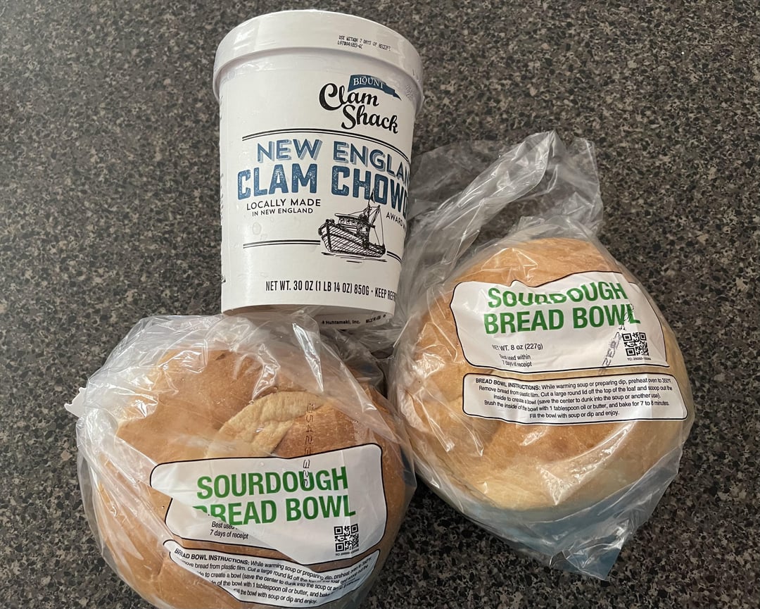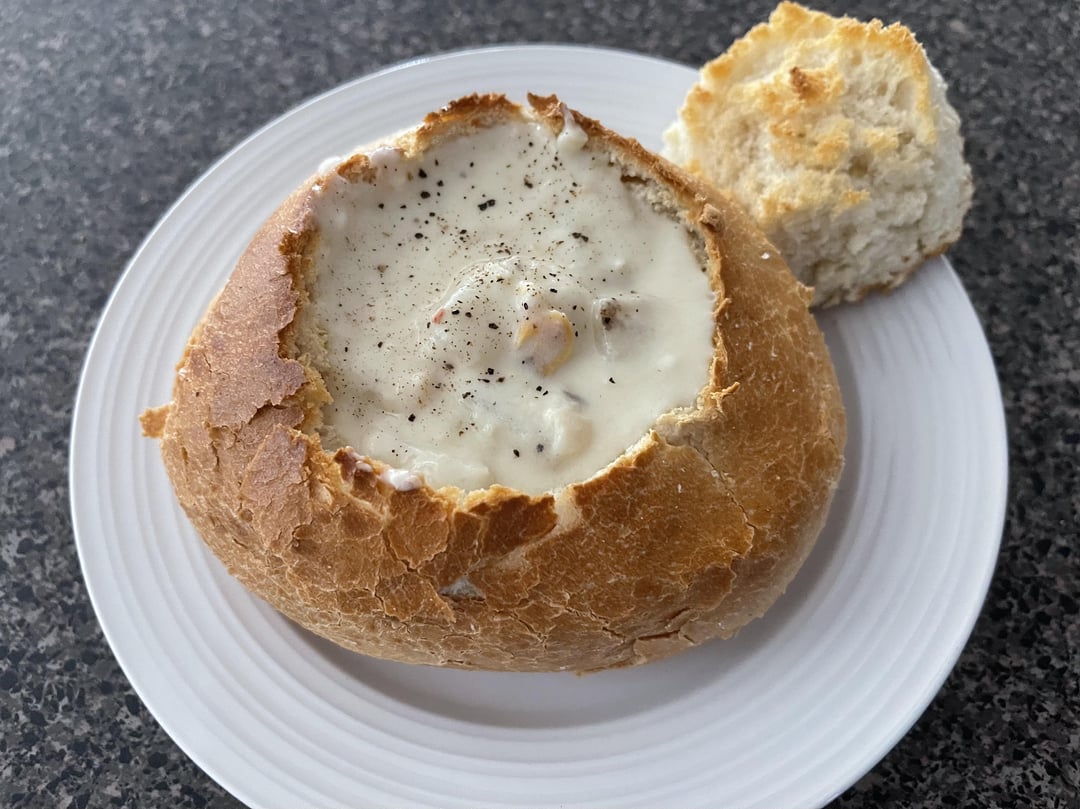 When I usually eat clam chowder I forgo the bread bowl, I usually don’t eat it and hate the waste. This wasn’t any different. I didn’t eat the bread bowl part after the chowder but I only used one for a bowl and the other bread loaf to eat.