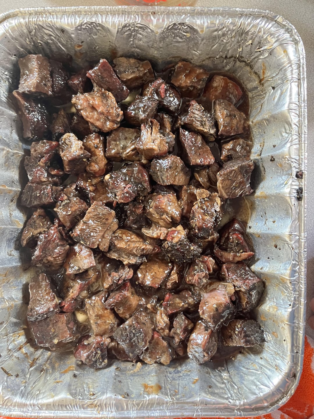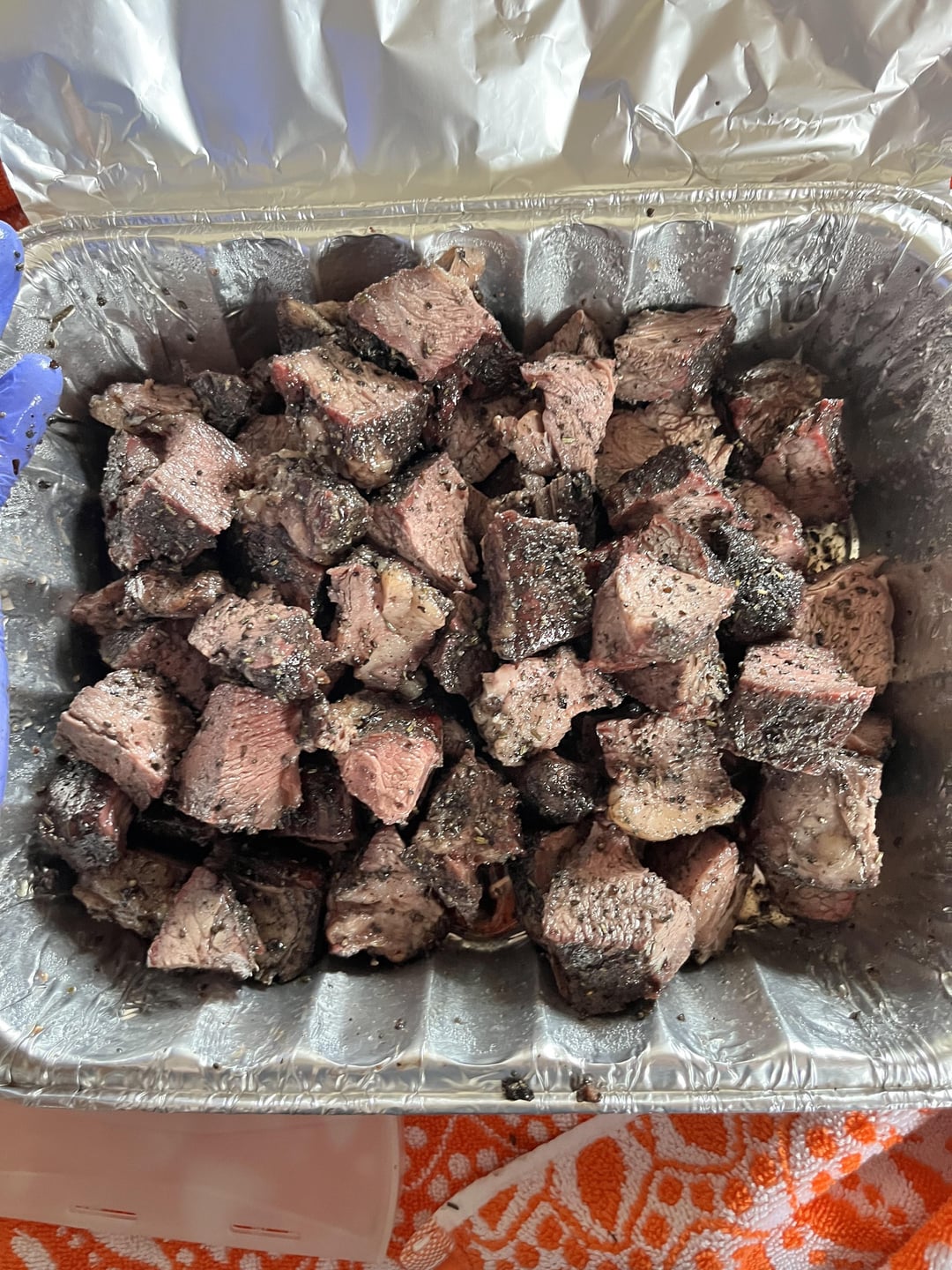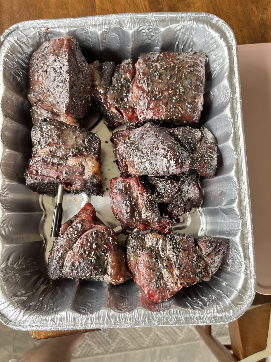 Add beef broth and apple cider vinegar to the pan and cover with foil back on the smoke for 2 hours (until 203+ degrees)