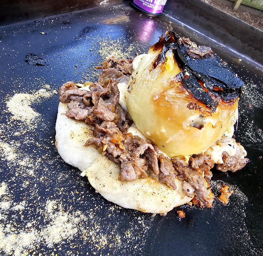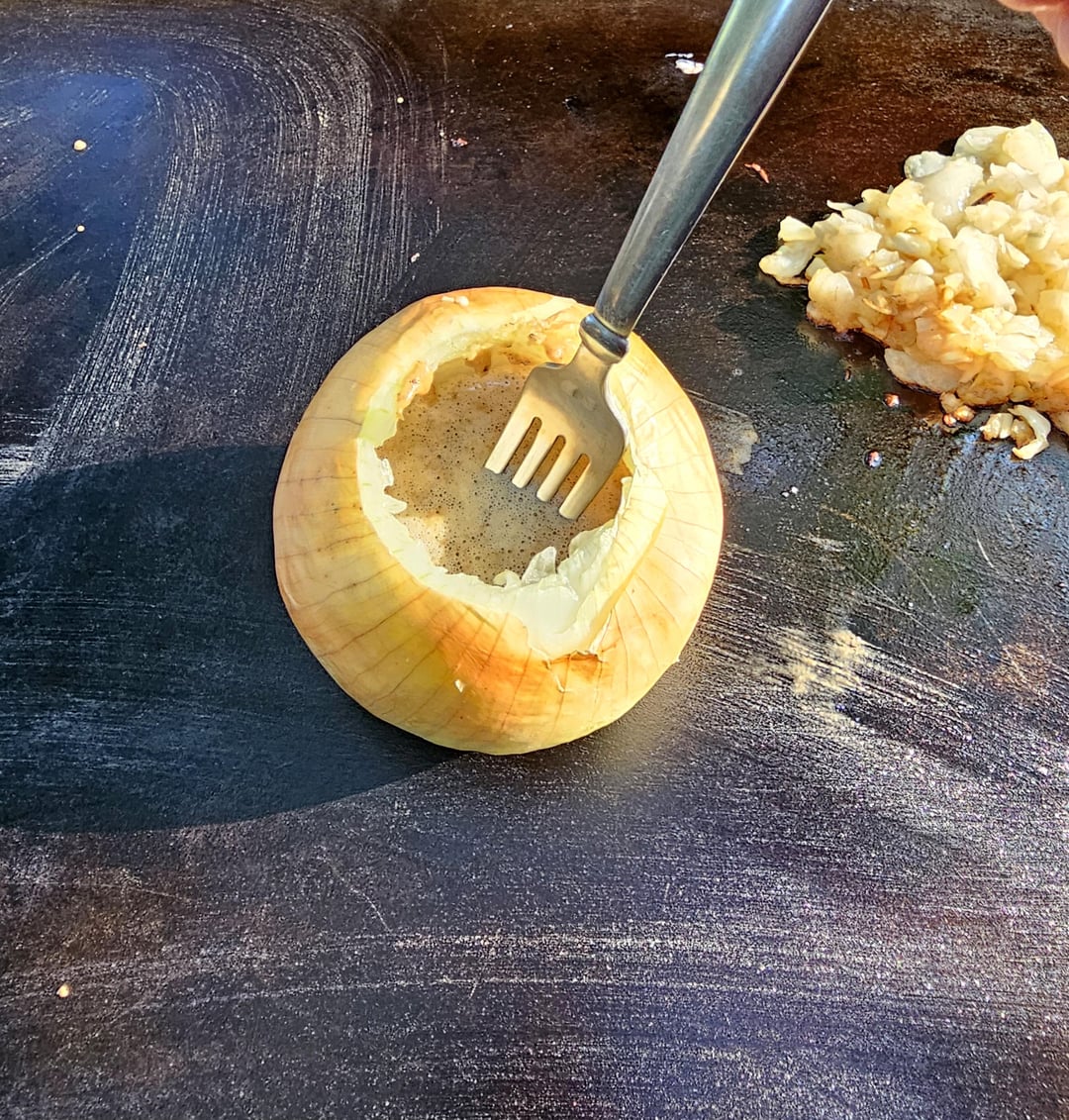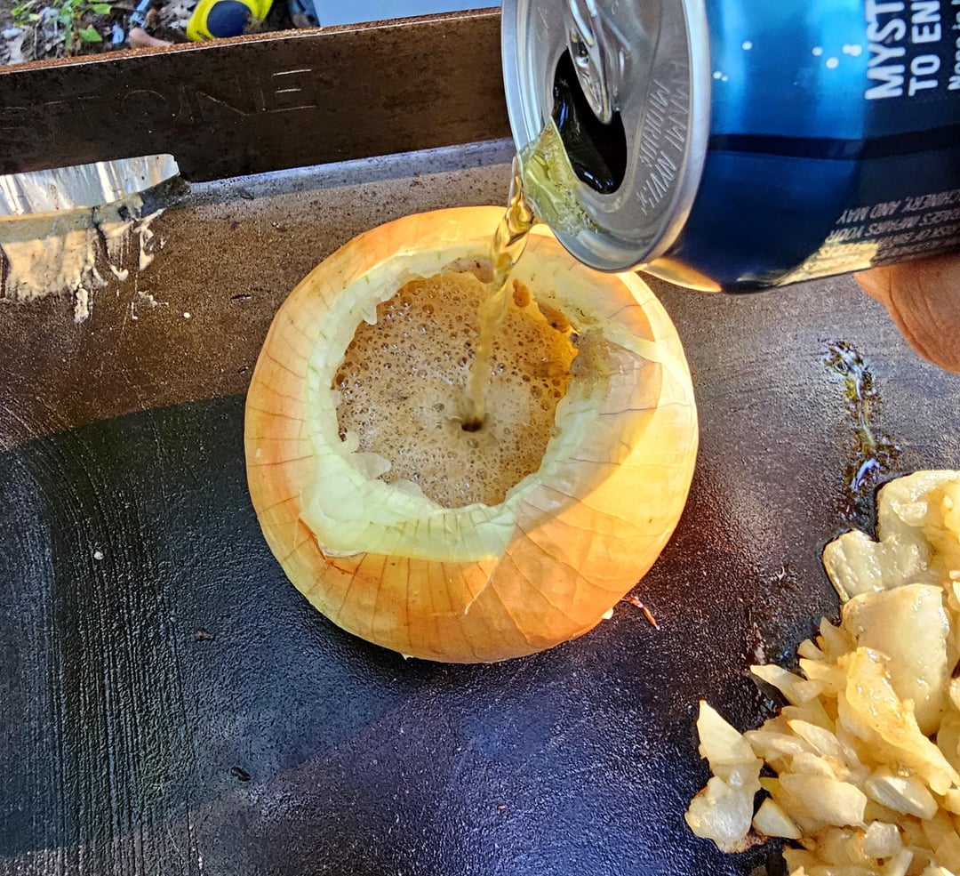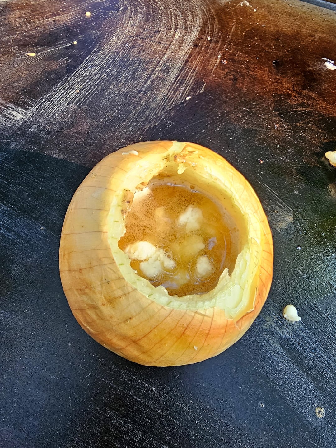 Flip your beer cheese filled onion upside down and leave it on top on low heat (also helps cook the dough through) and let the cheese slowly spill out, or squeeze it to speed things up, if you want a little more color on top, hit it a torch real quick and enjoy!
