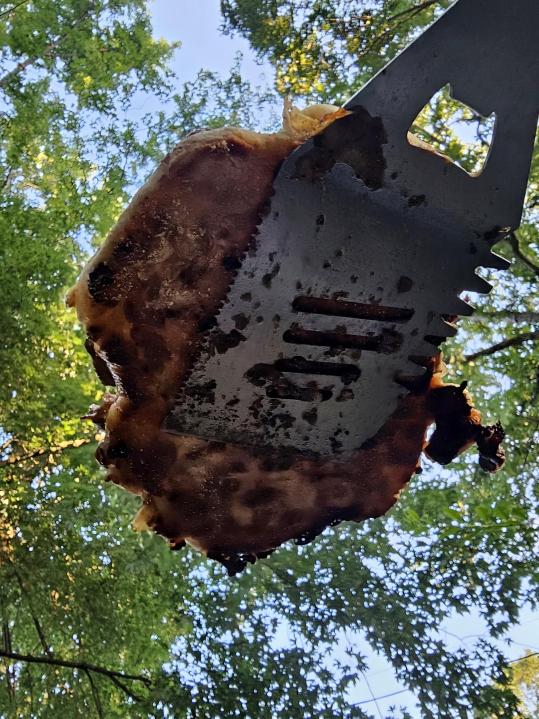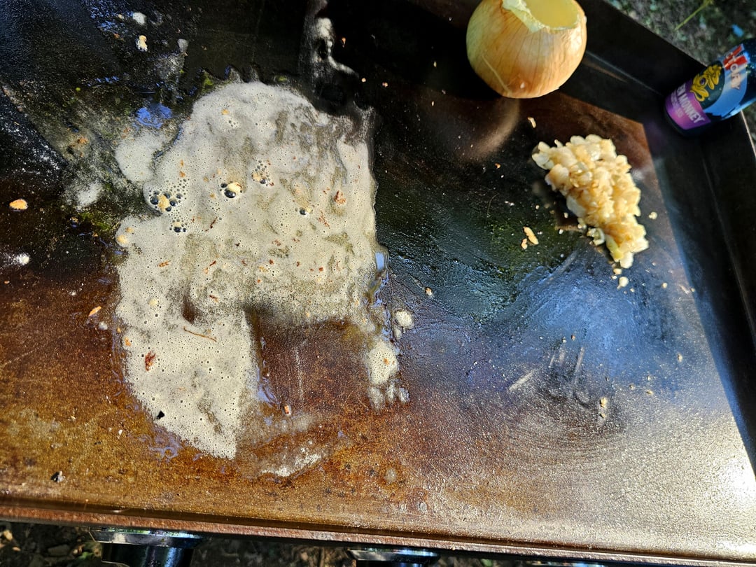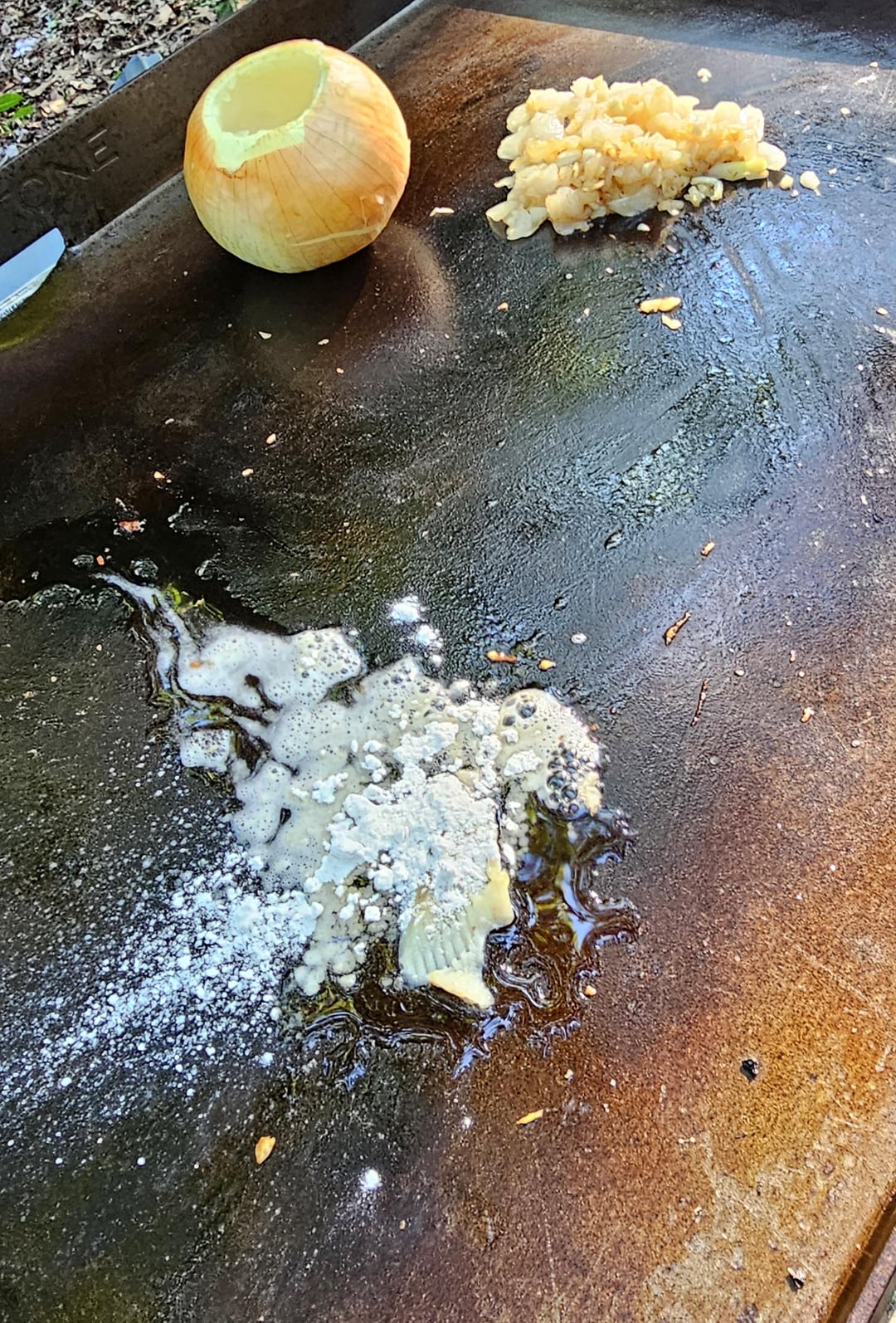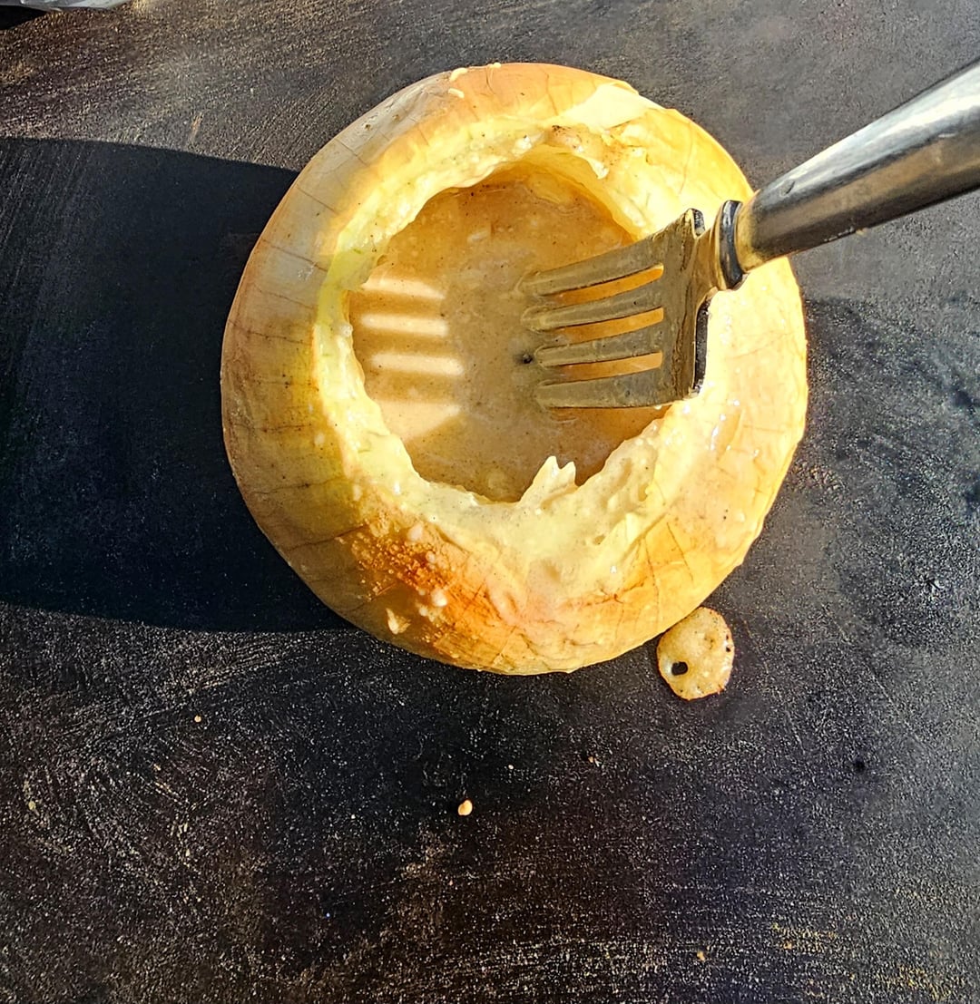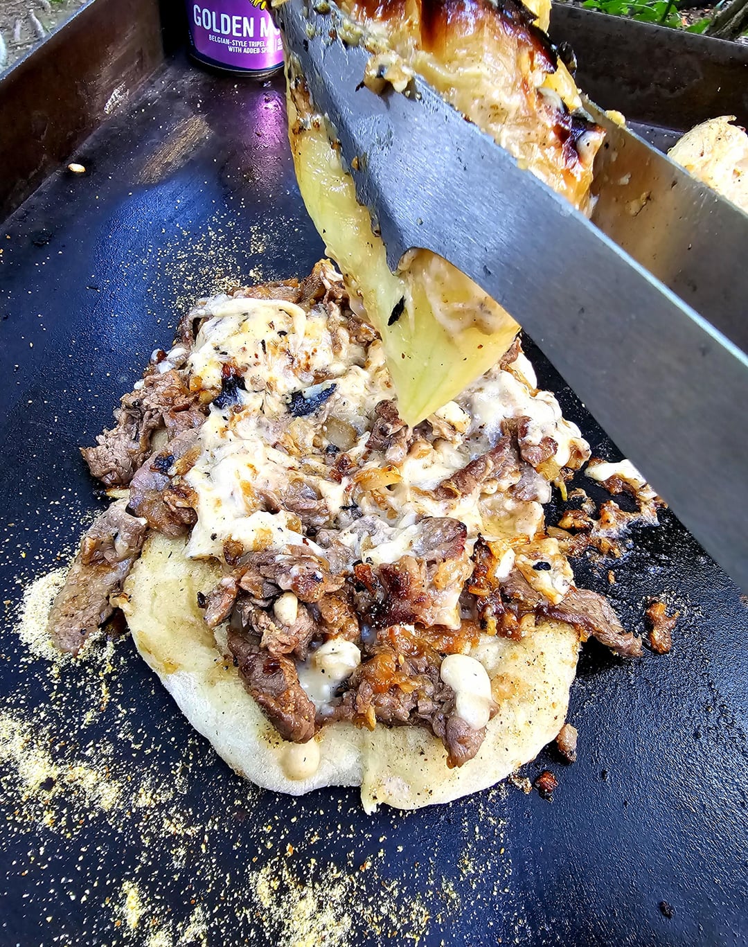 Flip your beer cheese filled onion upside down and leave it on top on low heat (also helps cook the dough through) and let the cheese slowly spill out, or squeeze it to speed things up, if you want a little more color on top, hit it a torch real quick and enjoy!