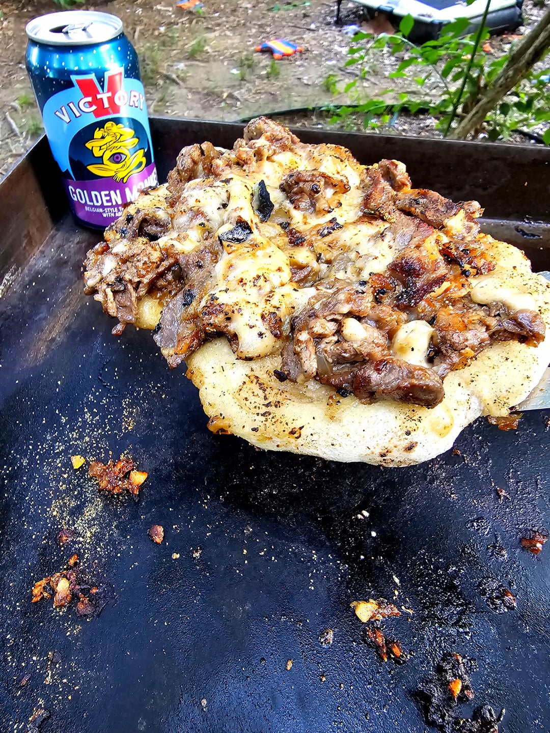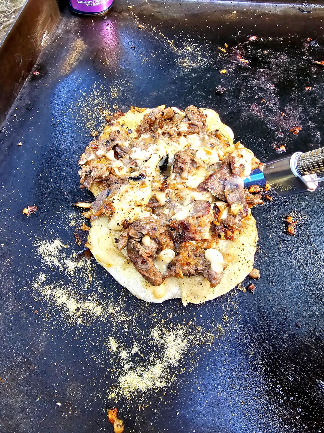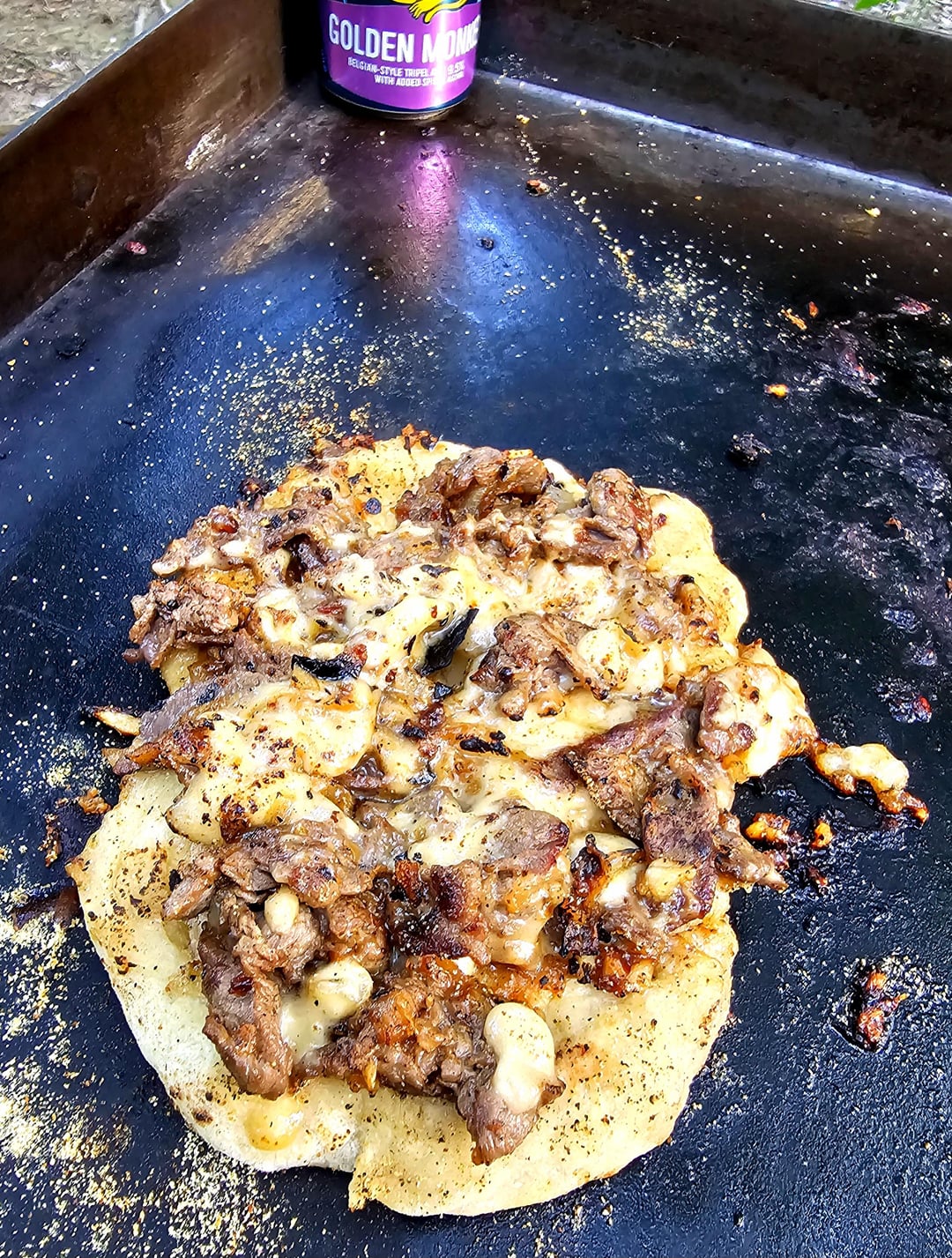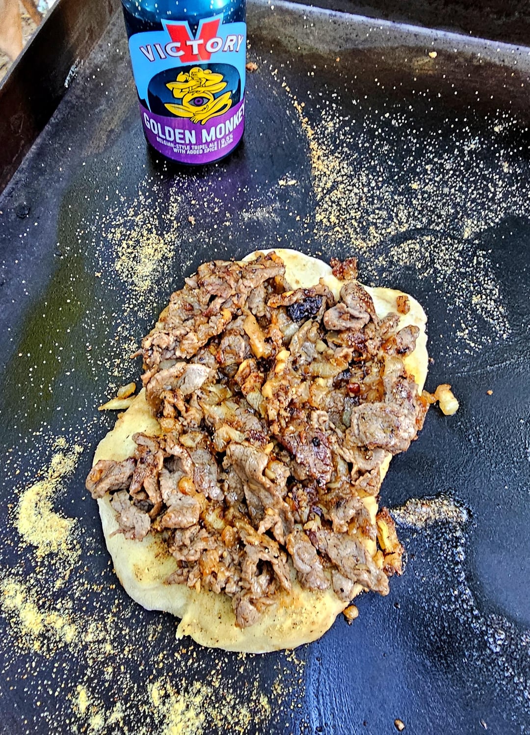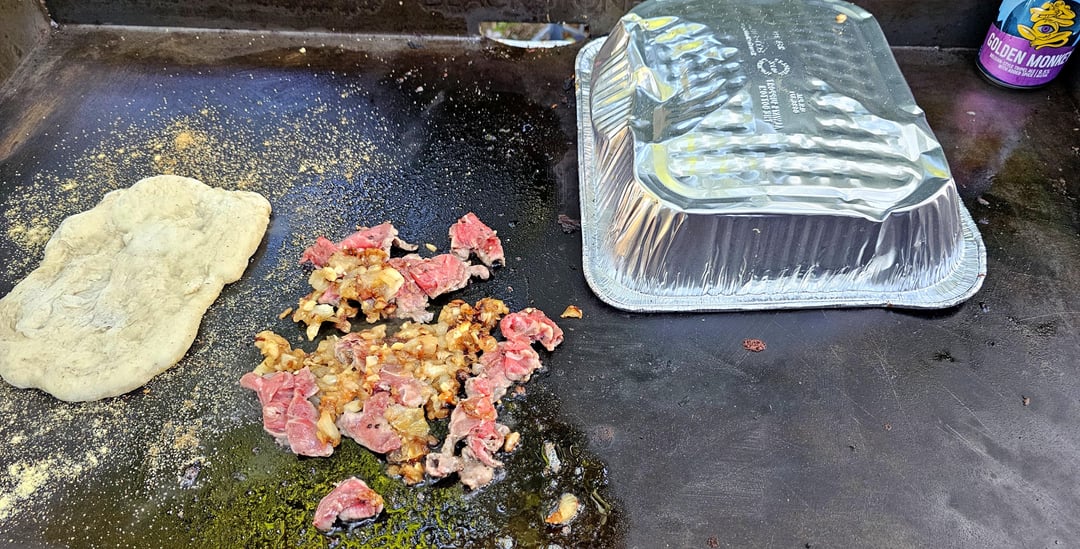 Add some steak, I sliced a partially frozen (makes it easier to cut thin) petite sirloin seasoned with salt and pepper, mix in the onion and garlic from earlier and get it on the dough..if the top of your dough is still doughy flip it or cover it so it cooks through