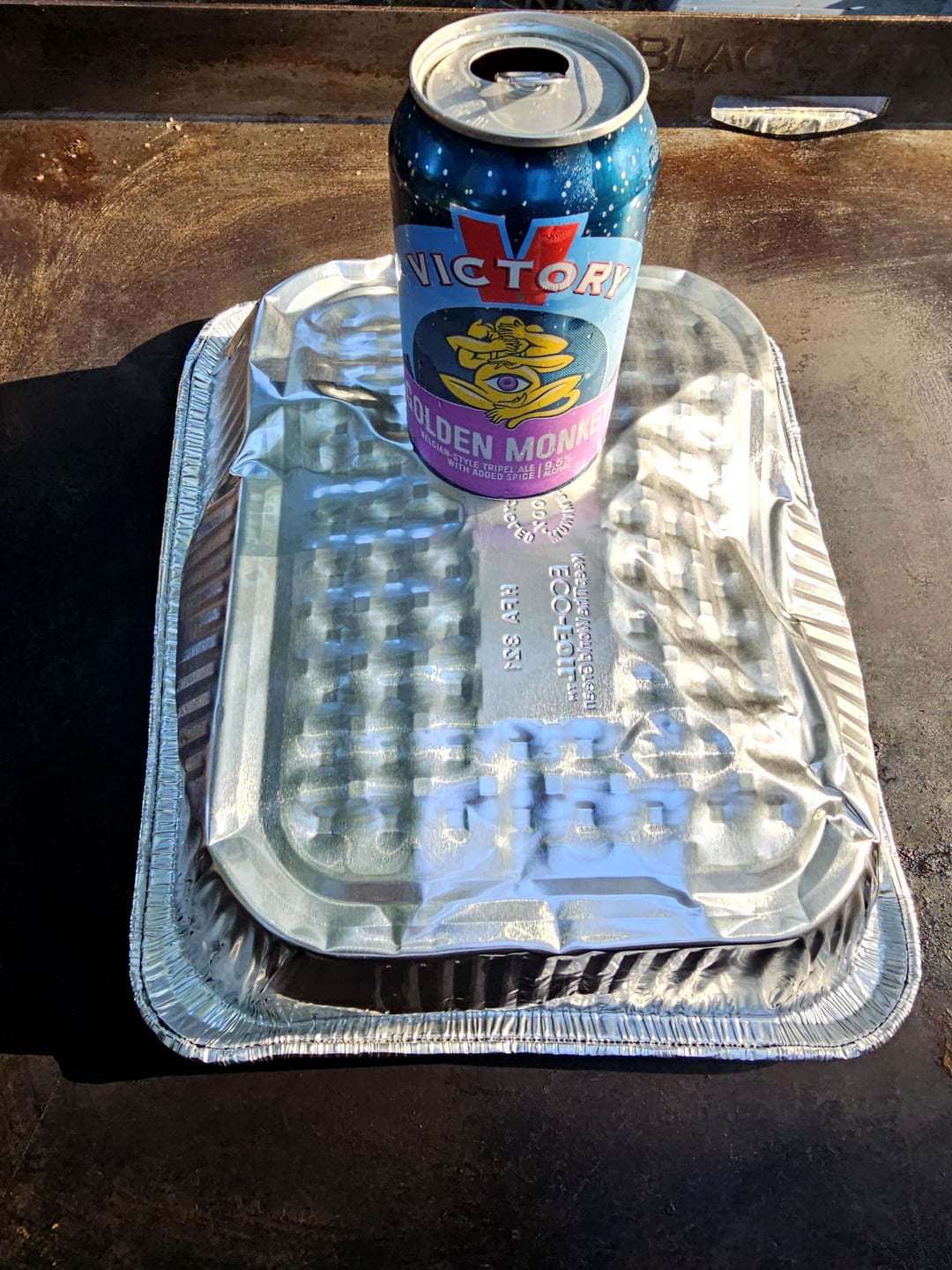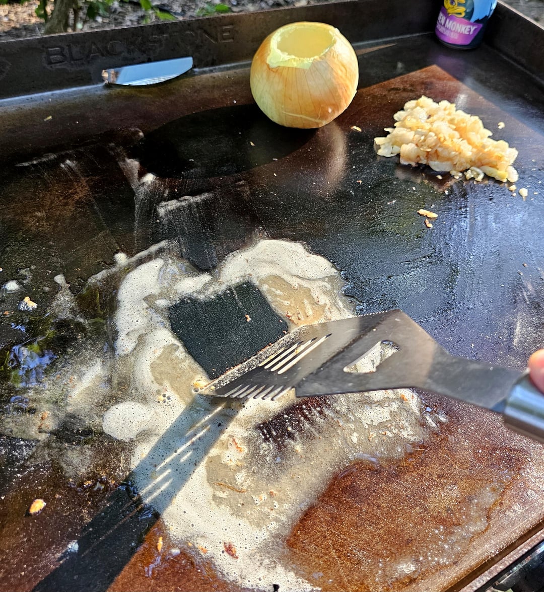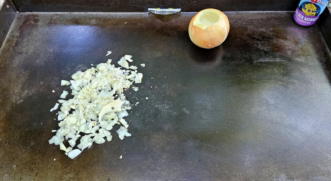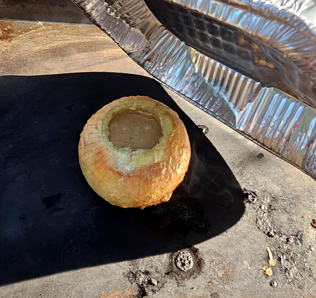 You're going to want a hot and warm side…toss the onion and garlic on the warm side with the hollow onion to get it preheated 🤣