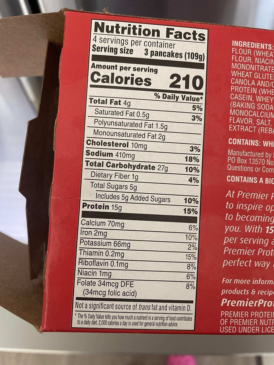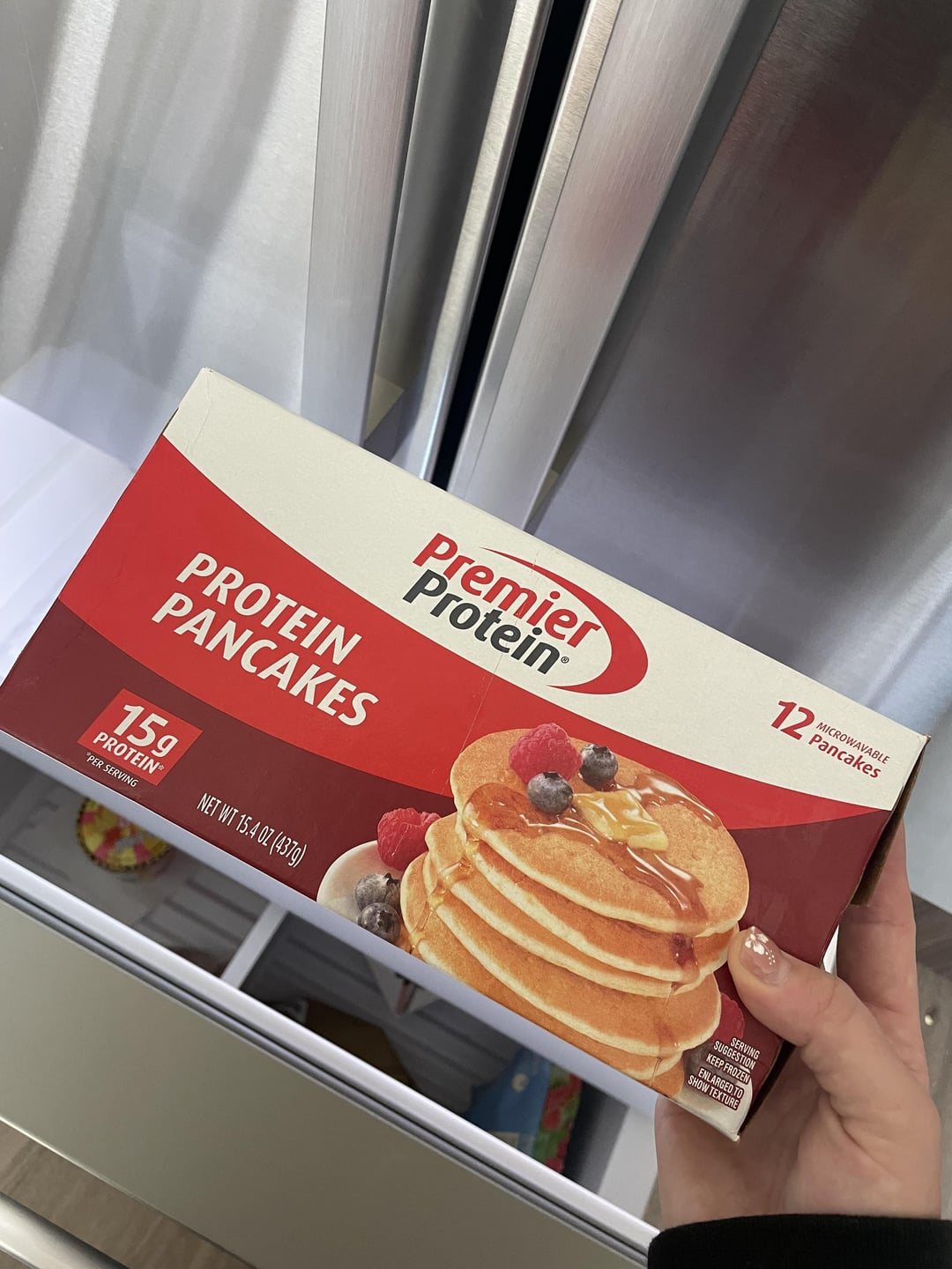 Saw someone post the premier protein waffles from Costco, but mine doesn’t carry them 😭. I did find premier protein pancakes at Walmart and they’re so good. I’ve tried them all, Kodiak, birch benders, etc and have always hated the grainy texture. These are the best protein anything I’ve tried (and a good price). I layered with one serving of Lilly’s chocolate chips. 270 calorie breakfast 👀 Could add 2 hard boiled eggs and still would be under 500.