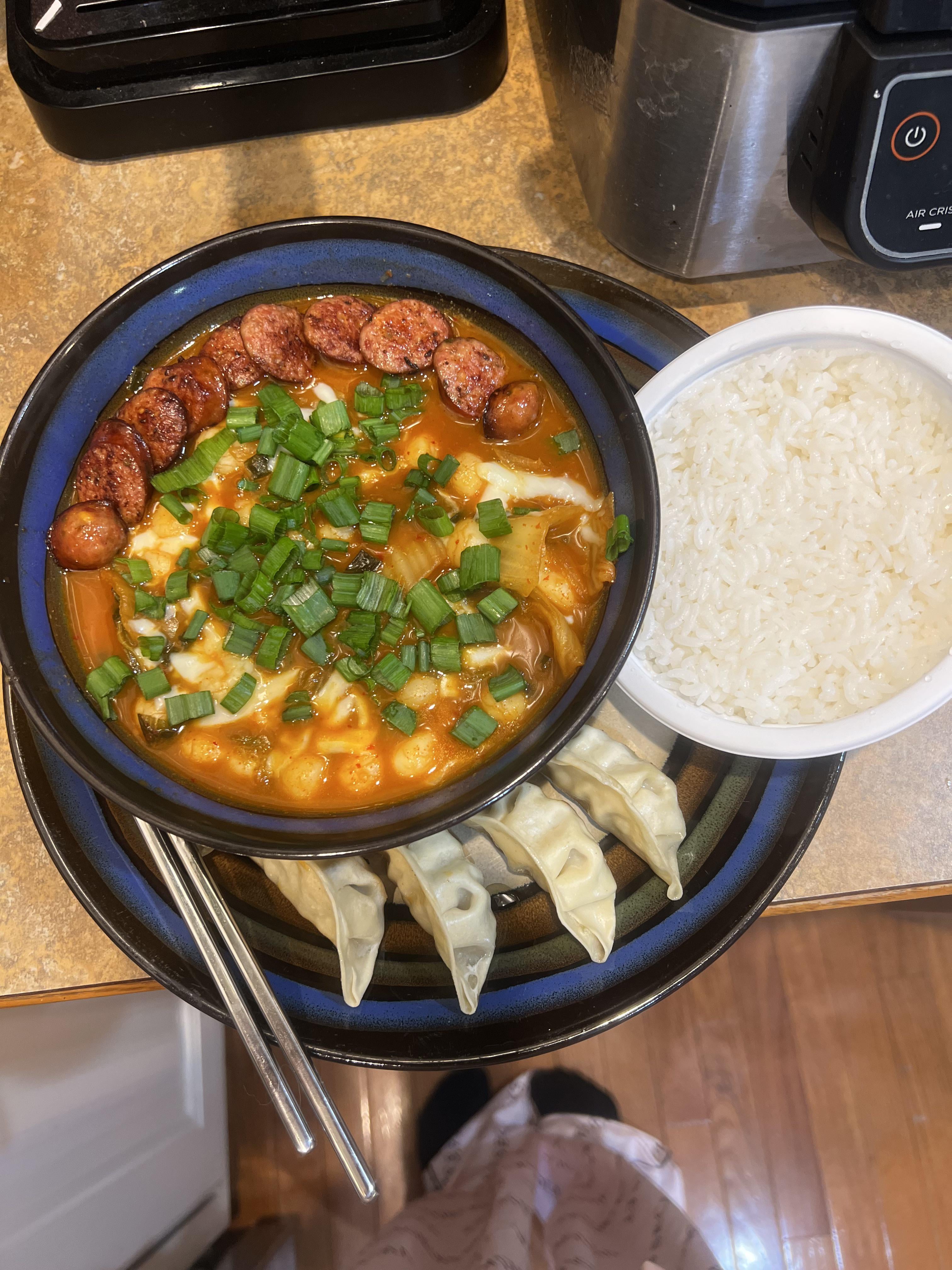 By no means am i claiming this is traditional but it’s the way i like it, rich spicy soup base from scratch wit any choice of meat topped with cheese (sue me) and chives hits every time. There’s also a poached egg in there