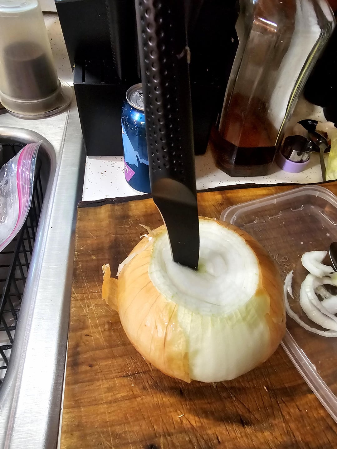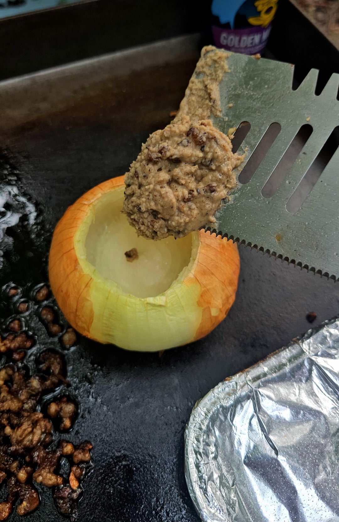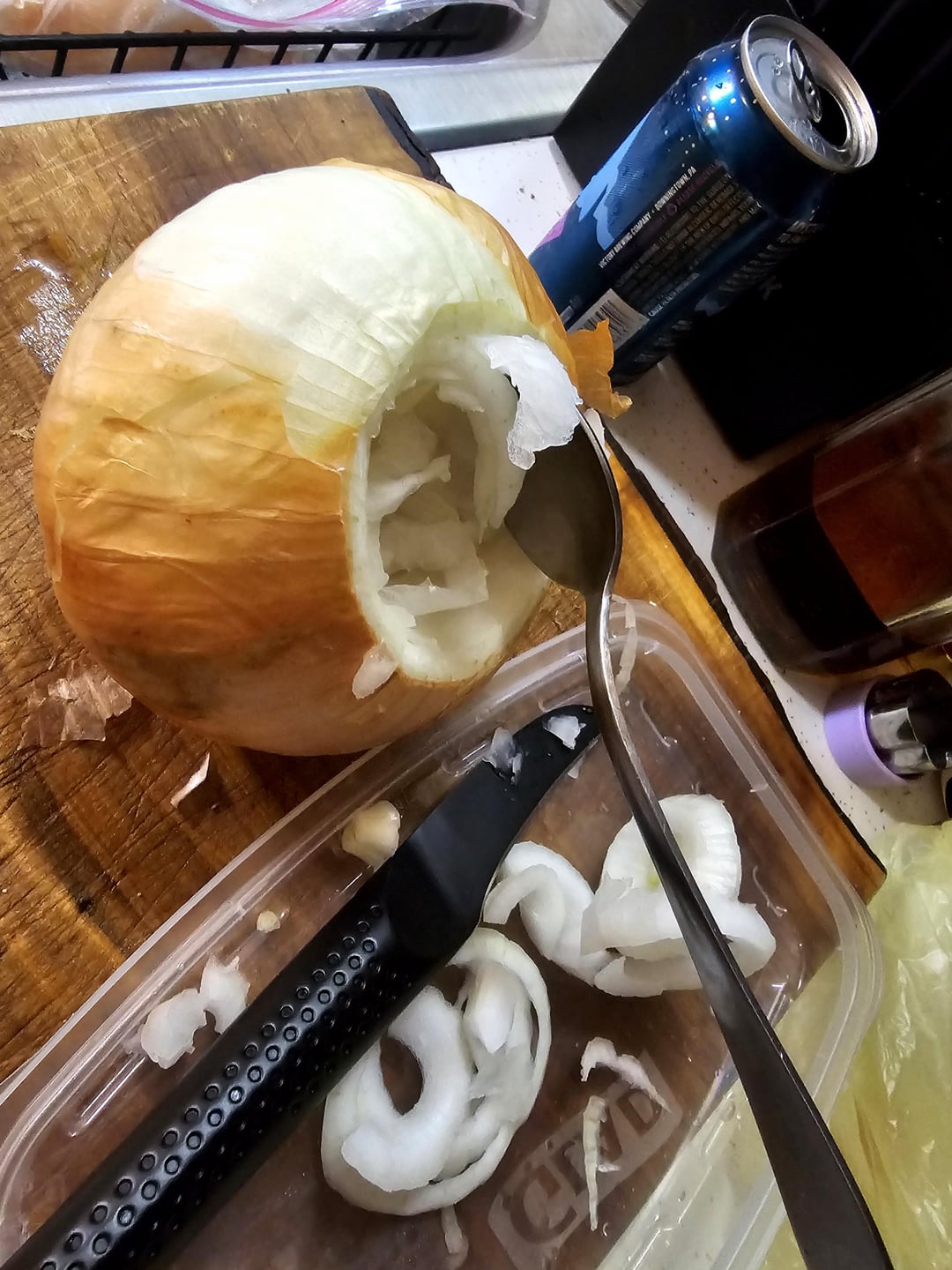 Start by playing knifey spoony to hollow a large onion, I try to leave the outer 2 layers