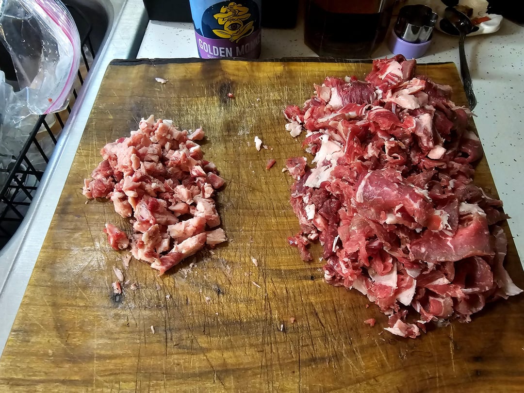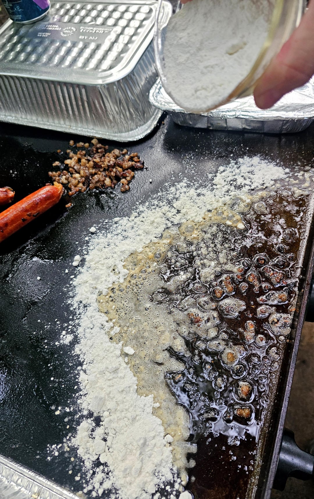 Make a roux. I used some minced ribeye fat since that's what I was using for my sandwich anyway. Render it on low-medium heat until the bits start to brown. You'll probably have to keep scraping the fat away from the drain so do it as far towards the front as possible. Remove the browned fat (I tossed it in with an onion garlic mix also for the sandwich) and start adding flour. Once it starts to turn to a paste and change color, put it into the onion.