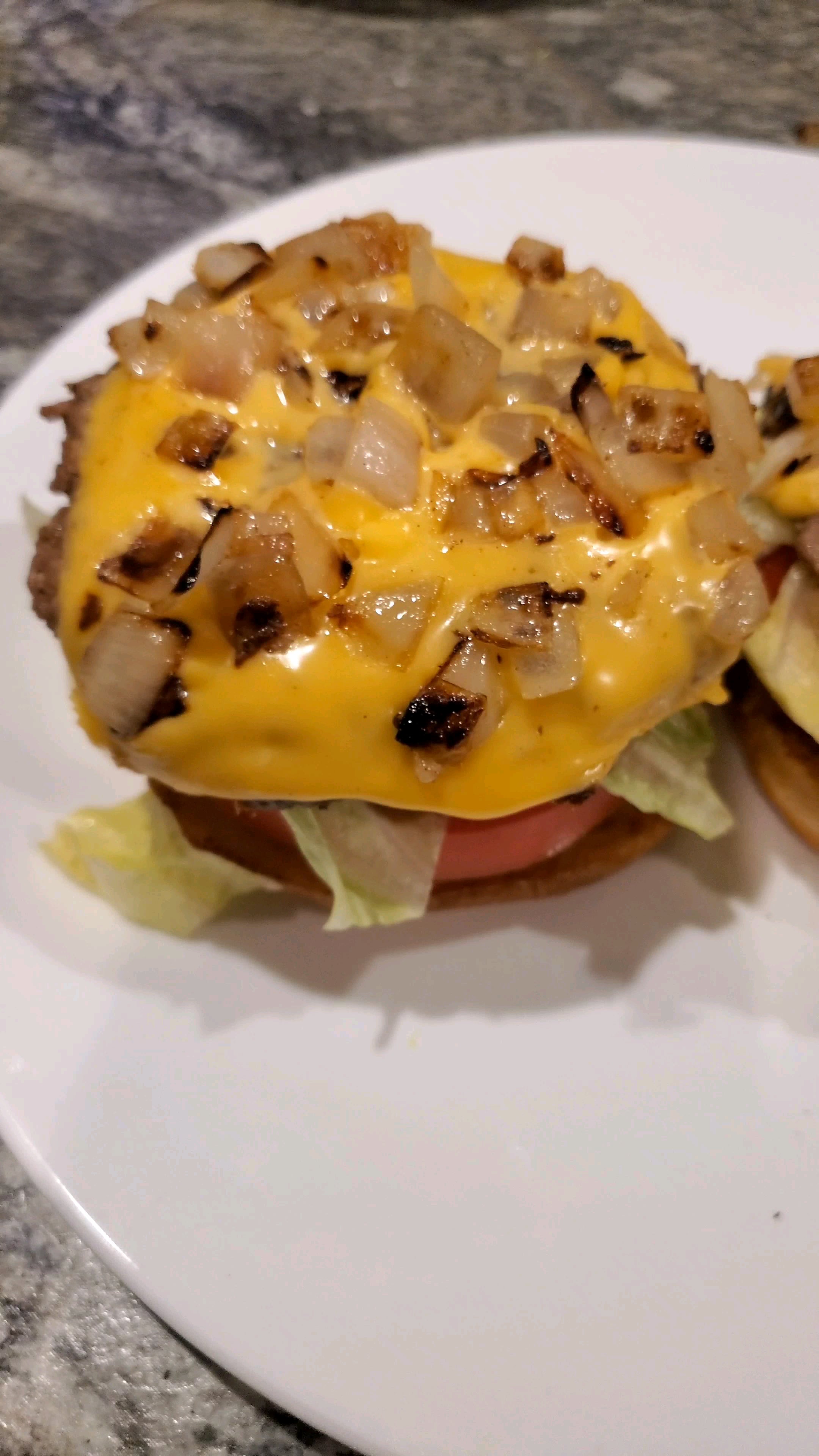 Duo of cheeseburgers for lunch on toasted sesame seed buns with ketchup and mustard, diced raw onion, pickle, thicc tomato slice, lettuce, grilled onions and a whole grilled onion slice.