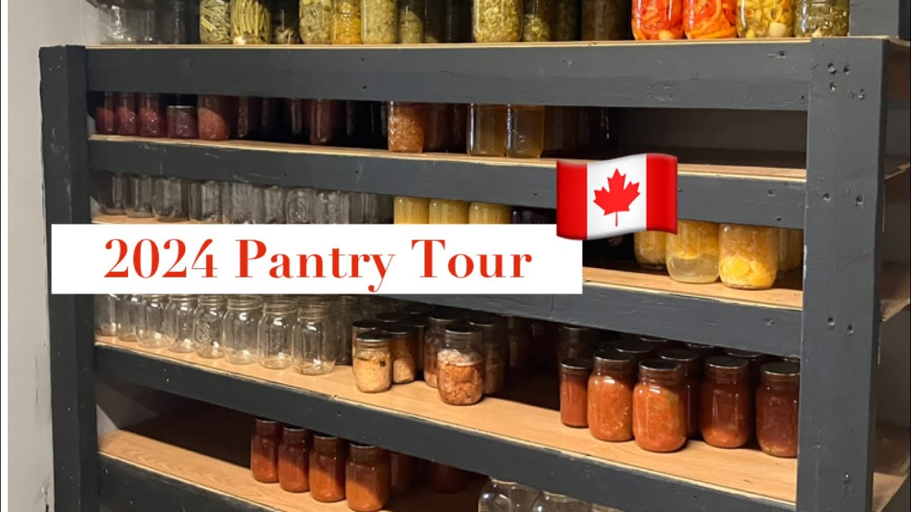 An update on the state of my pantry after 7 months of $650/month grocery budget for a family of five in Nova Scotia. This is the pantry pre harvest season so the canning shelf and cold room are looking pretty bare. However the freezer is exploding with food so we will need to eat our freezer meals to make room for garden veggies. #abundance #budget #groceries #novascotia #frugalliving #selfreliance #garden #canning