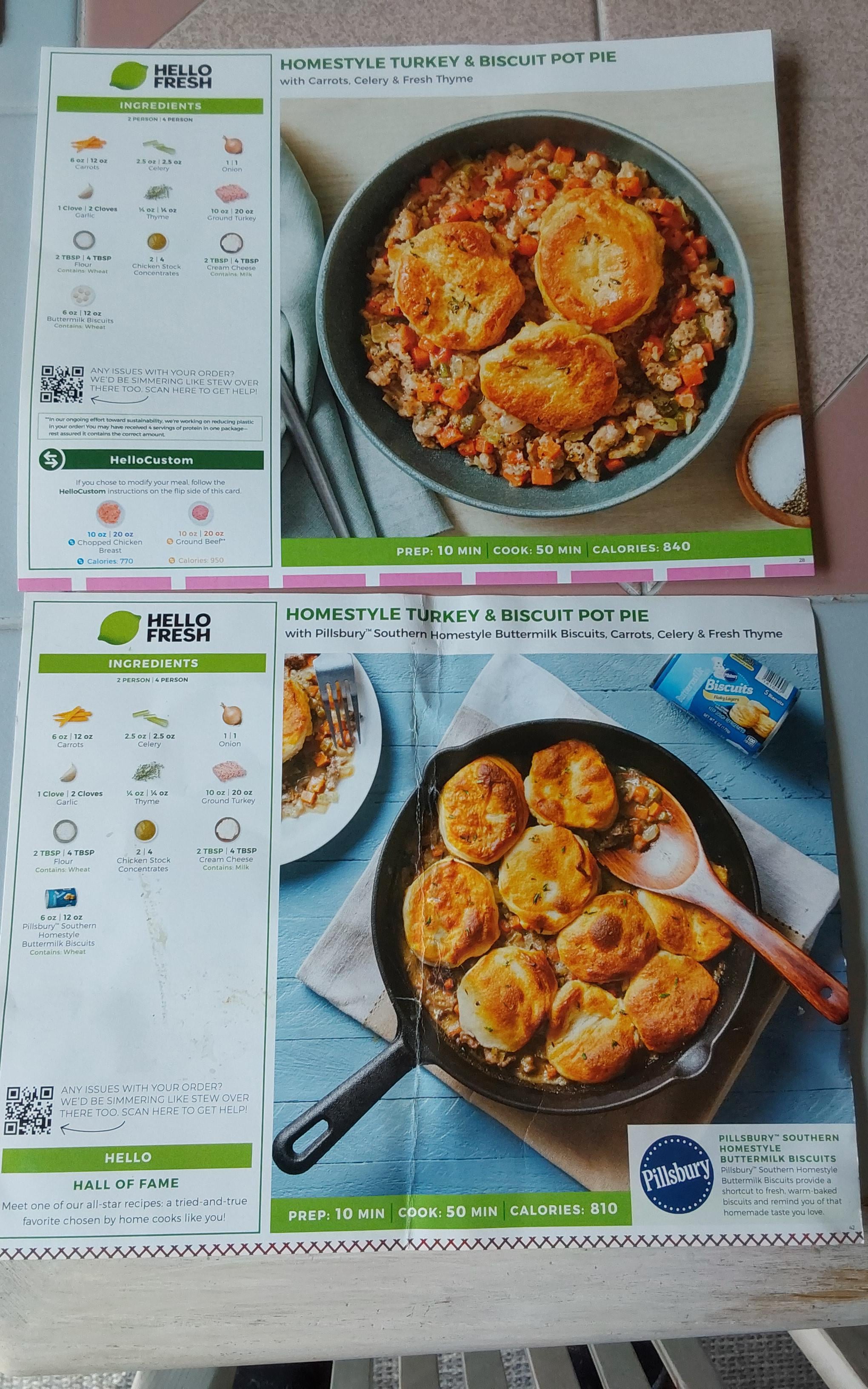 Apparently Biscuits have become too expensive. One of my favorites: Homestyle Turkey & Biscuit Potpie appears to now have 65% less biscuits. The biscuit can they sent is much, much smaller than what I have previously received. The updated meal picture emphasizes this. (Top pic is the "new improved" recipe, the bottom pic is the previous version). Big sigh.. so sad. Did it really save HF that much money to downsize?