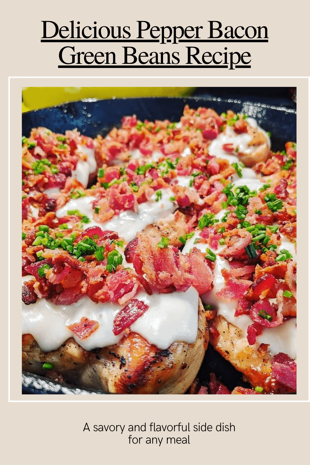 * In a hot skillet, add the chopped pepper bacon. * Stir frequently, until nearly done / crisp, about 2 minutes prior to being done. Drain most of the grease off. * Add the chopped red onion. Stir frequently until the onions are turning clear. * Then add the chopped green beans, stir in well, and cover for about a minute or two, stir again, and repeat until they are “aldente” or bright green and still have a bit of crunch left in them. * Plate them up for a nice, tasty lunch, a great side, or even for dinner!