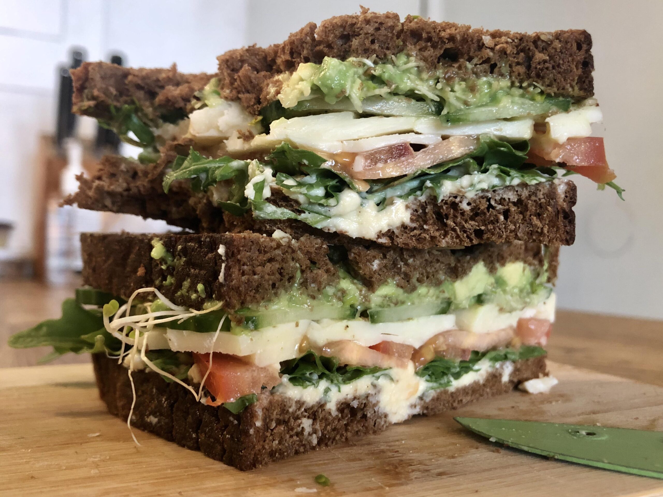 Avocado, sprouts, cucumber, cheese, tomato, Romain, mayo on dark rye? Am I close?