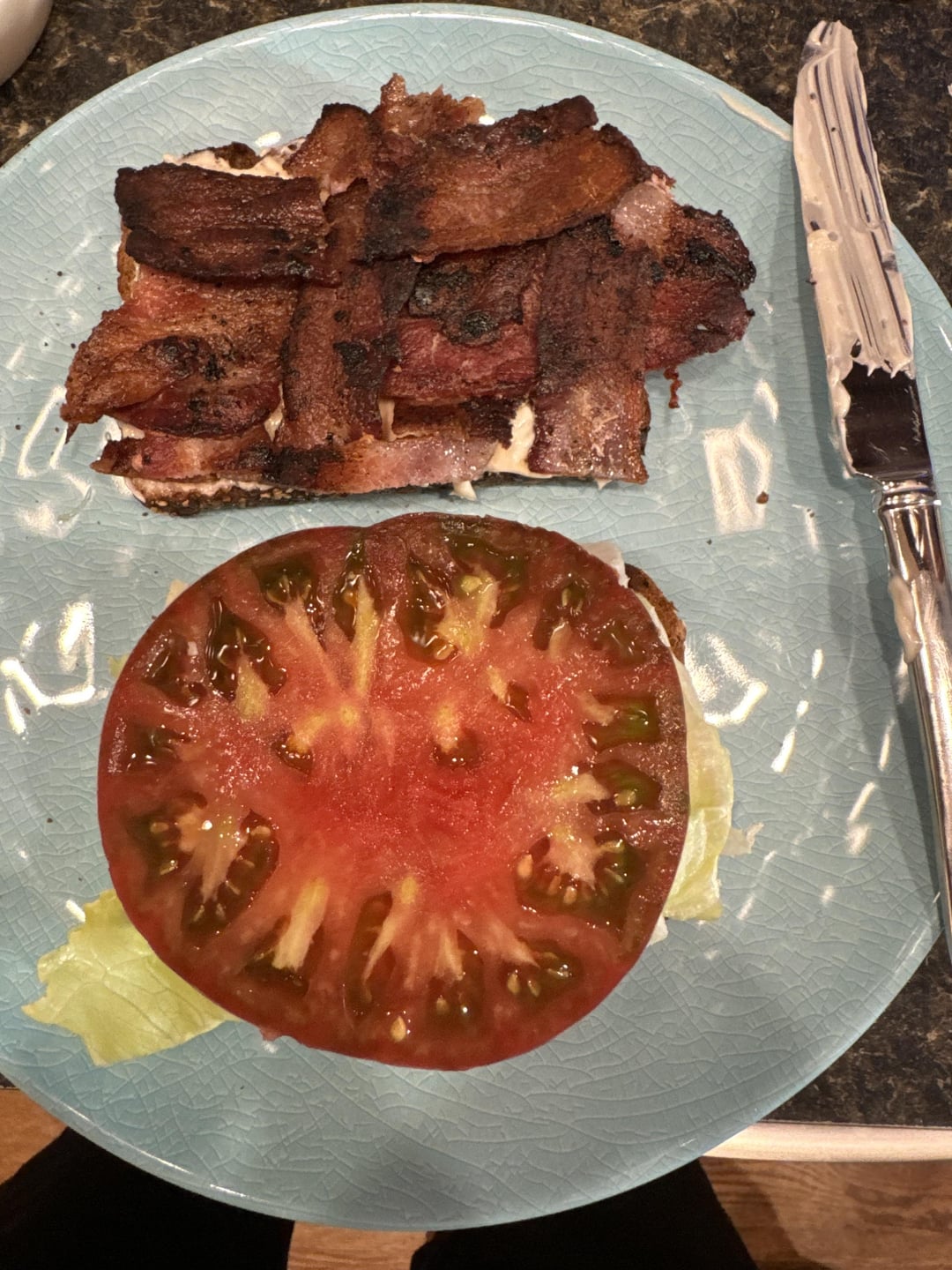 My daughter(19) came home for the weekend so I had been holding off on harvesting! She loves tomatoes! We had so much fun harvesting each variety showing any blush! Then her brother was picking her up to take her to a really nice restaurant but she had to have one of Dad’s BLT’s as an “appetizer” with a fat slice of Cherokee Purple! He arrived just as I finished making it so she ate in his car on the way to dinner!!!😂 He had a bite too and said it was delicious! Definitely my kids!!!
