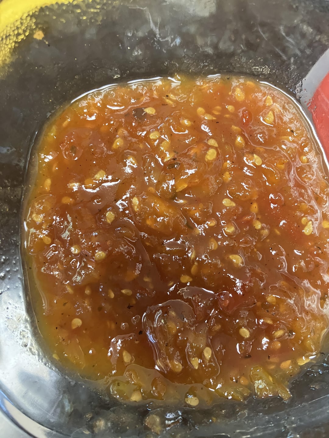 I mislabeled this tomato when I planted the seeds so I planted a LOT of yellow pear snacking tomatoes. In addition, I’m not fan of the taste. I’m trying out recipes to find the best use for them. This is tomato jam, also a fail. It’s too sweet and has too many seeds.