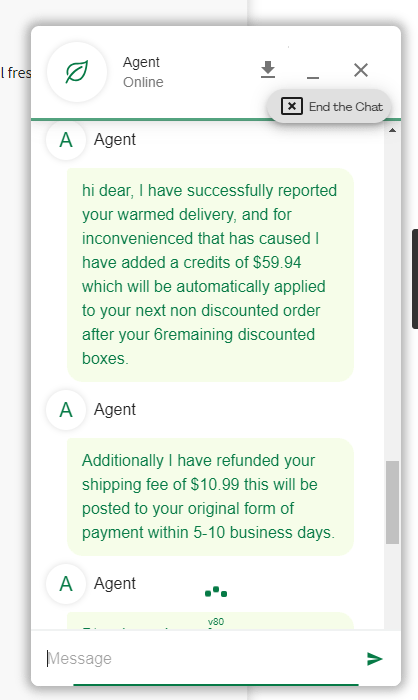 Box arrived warm. Rep offers to refund shipping and credit redeemable AFTER spending $420