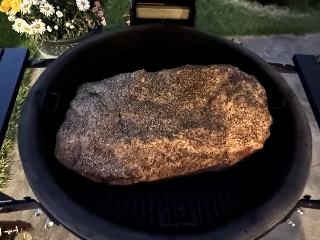 My first brisket turned into chipped beef, Which made amazing SOS sandwiches, but not even close to BBQ. Second attempted brisket, a Snake River Farms supermarket special, which barely fits in the Joe. Starting before the roosters crow, keeping at 225 or lower for 12 hours. Wrap at 150? Pressure is on, will feed 25 people…