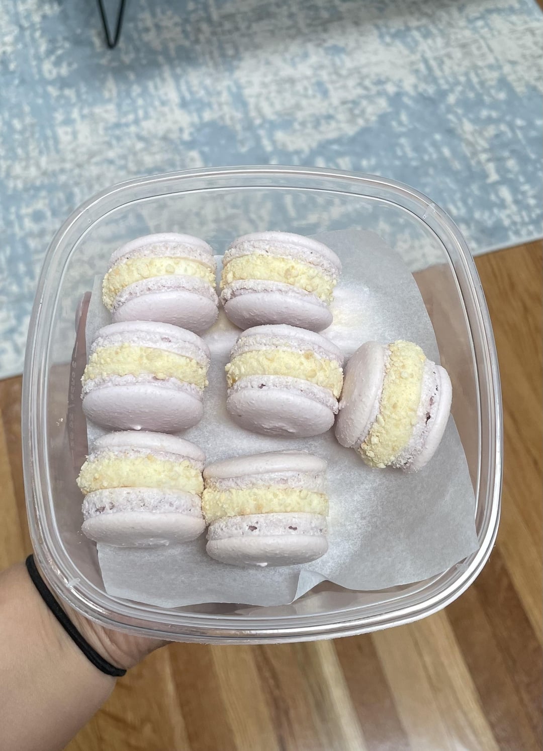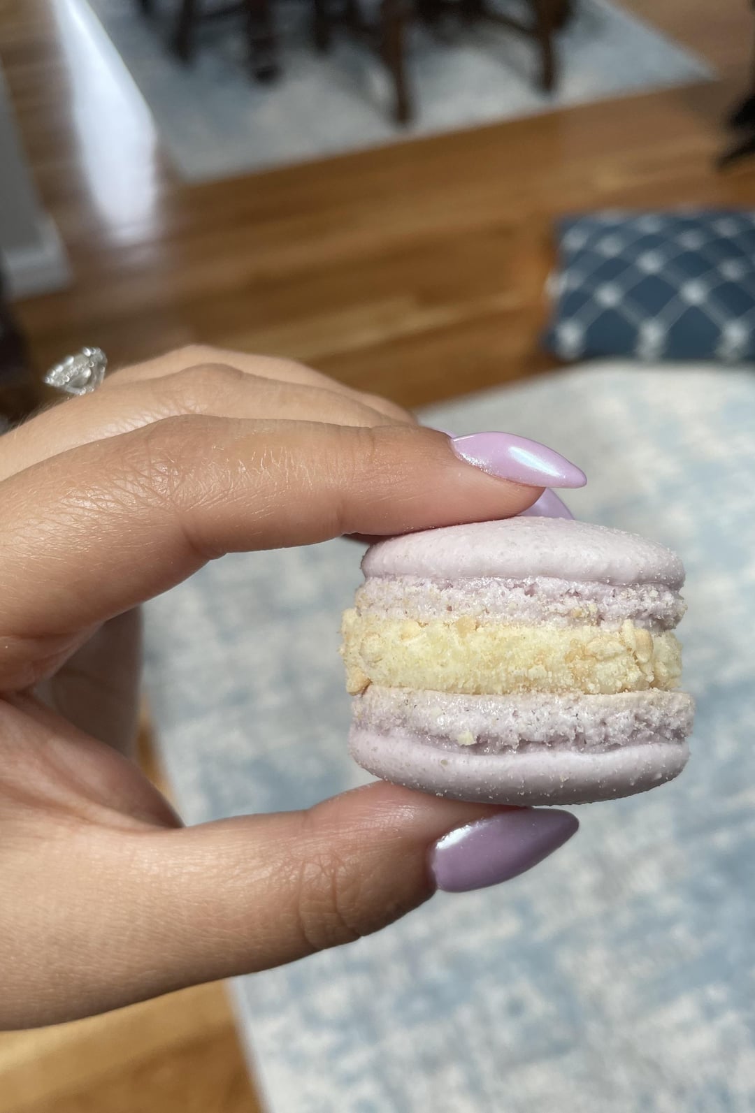 67g egg white, granulated sugar, powdered sugar, almond flour + pinch of salt, baked 300F 15 minutes.