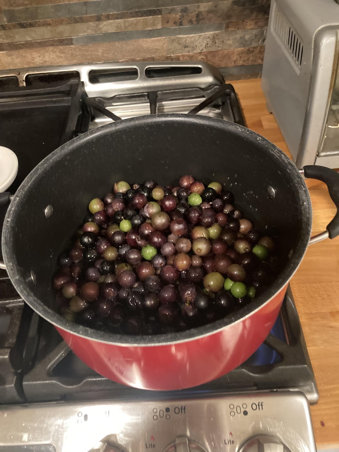 Wanted to show off a bit. I LOVE mustang grape jelly. It’s tarter and more acidic than a concord jelly. The grapes grow wild and mature in July, so I’m busy now making enough to last all year + give away as gifts.