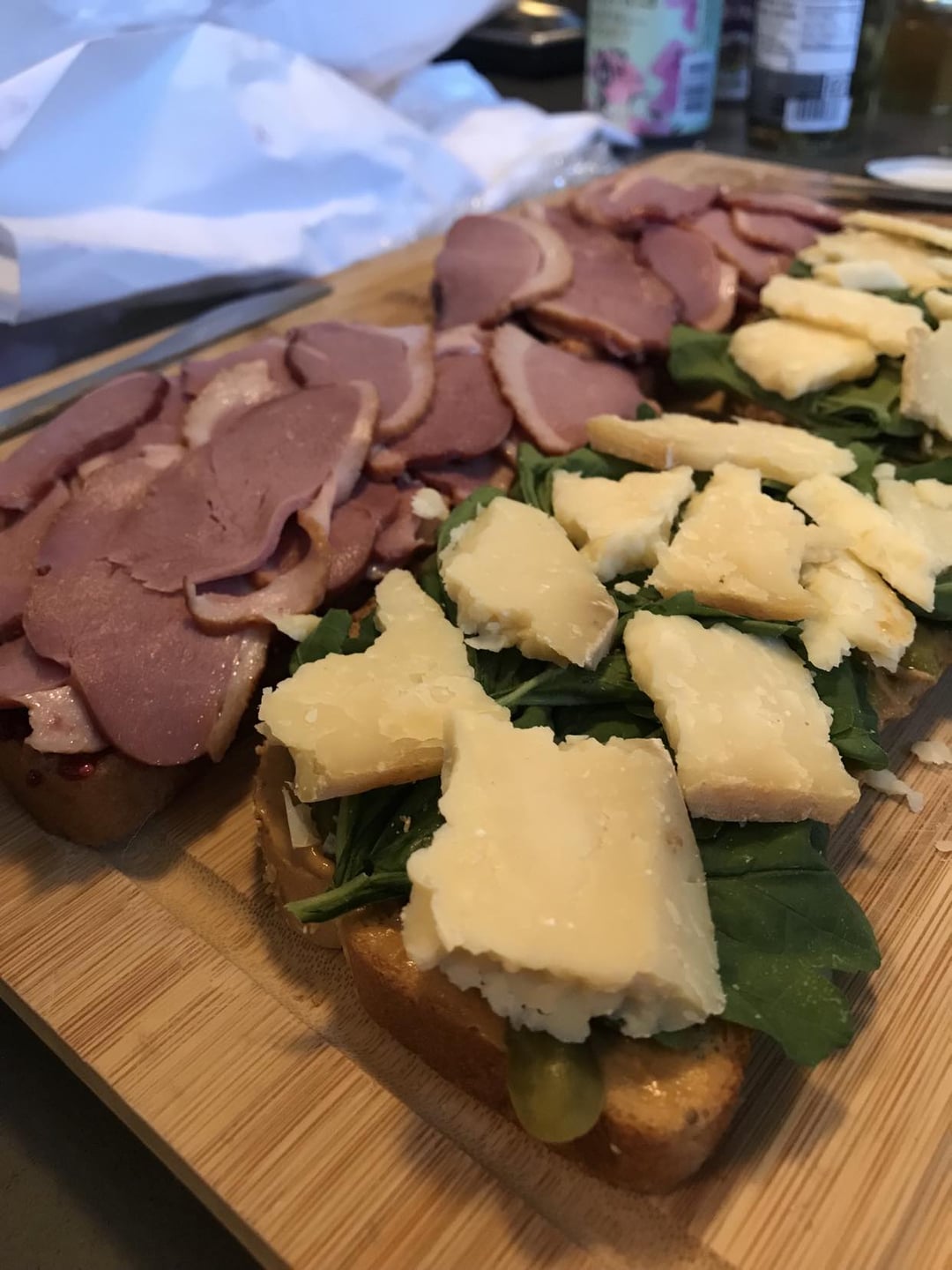 Sort of a ‘reconstructed’ cheese board. All of this stuff would be good individually with the cheese, but I usually don’t ball it all up at once.