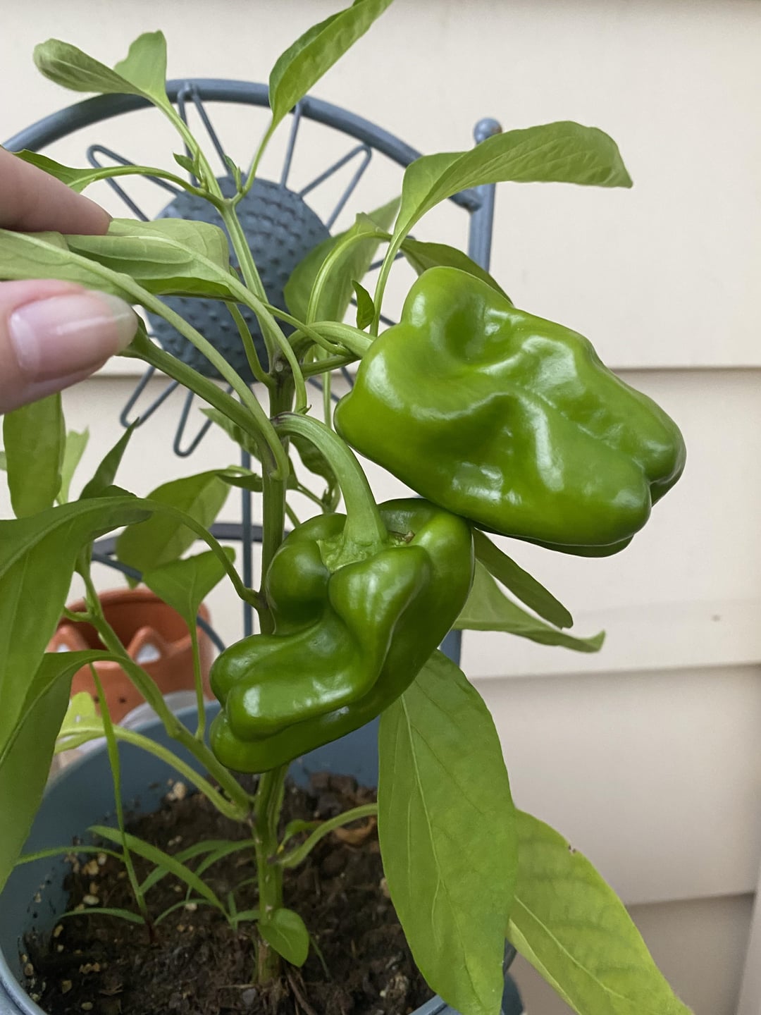 I have a plant producing peppers that look like this and I was told they could be Cuban peppers. My bell pepper plant looks more “picture perfect” compared to this plant. They look similar – even I was looking for identification a while ago.