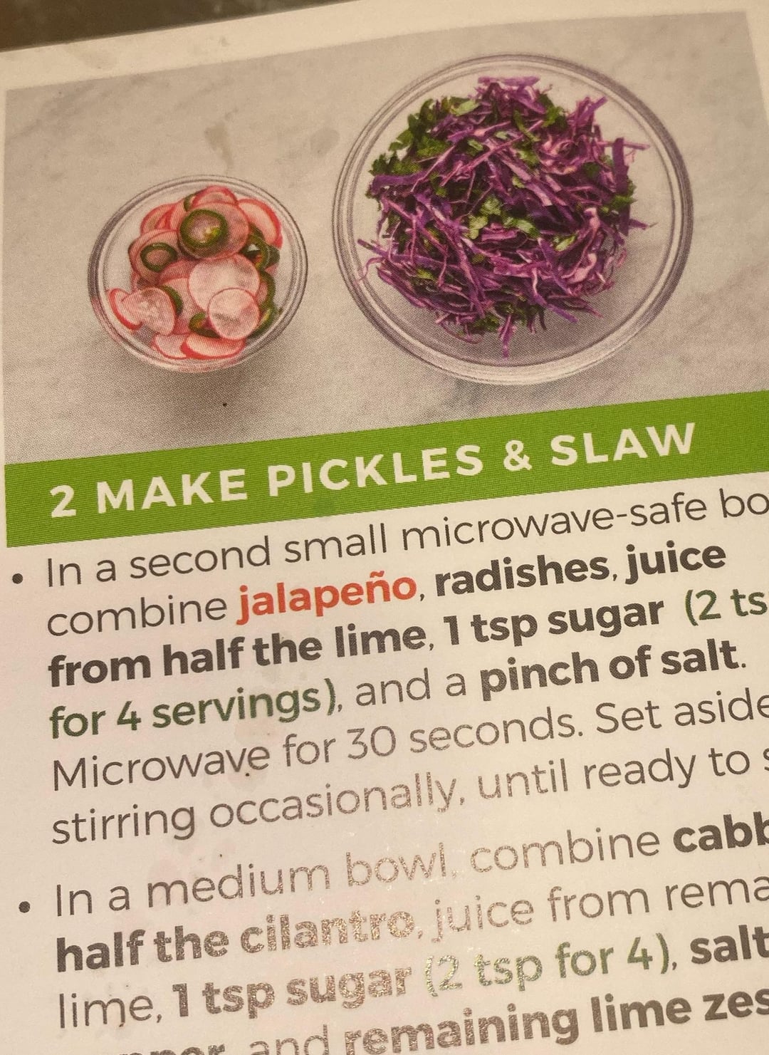 This was the first taco meal I did a couple of months ago and got me to do more taco meals. They’ve been good as well, but this one was absolute fire. The pickled radishes and slaw was so good. I love radishes and wouldn’t have thought to add them to tacos before.