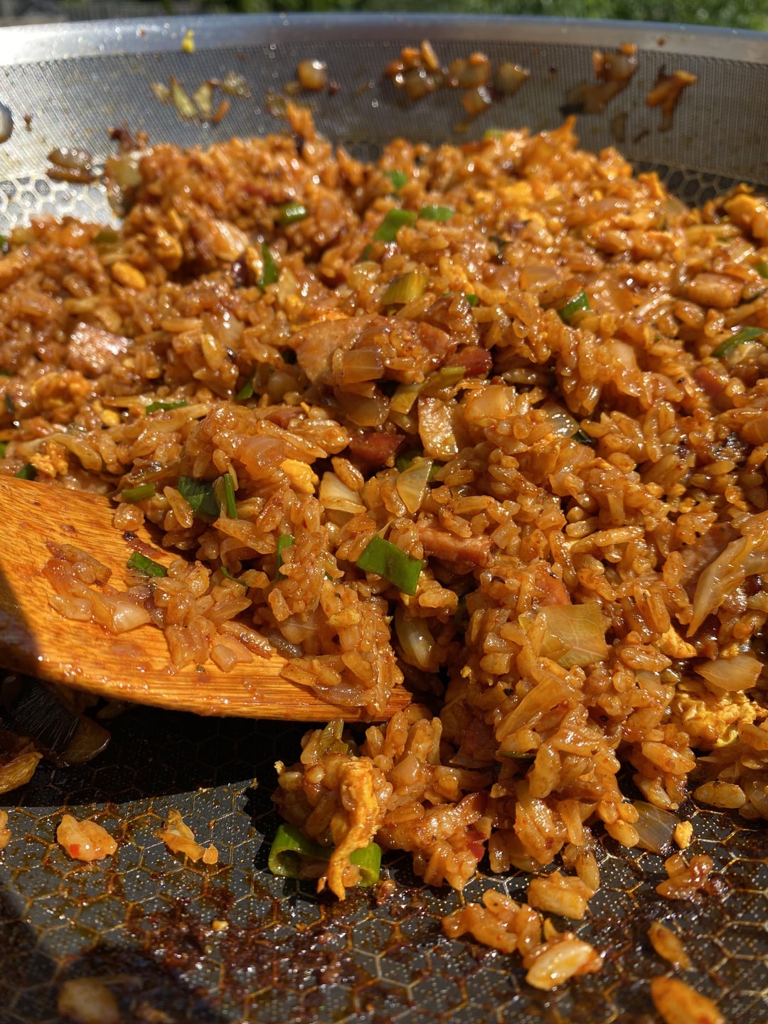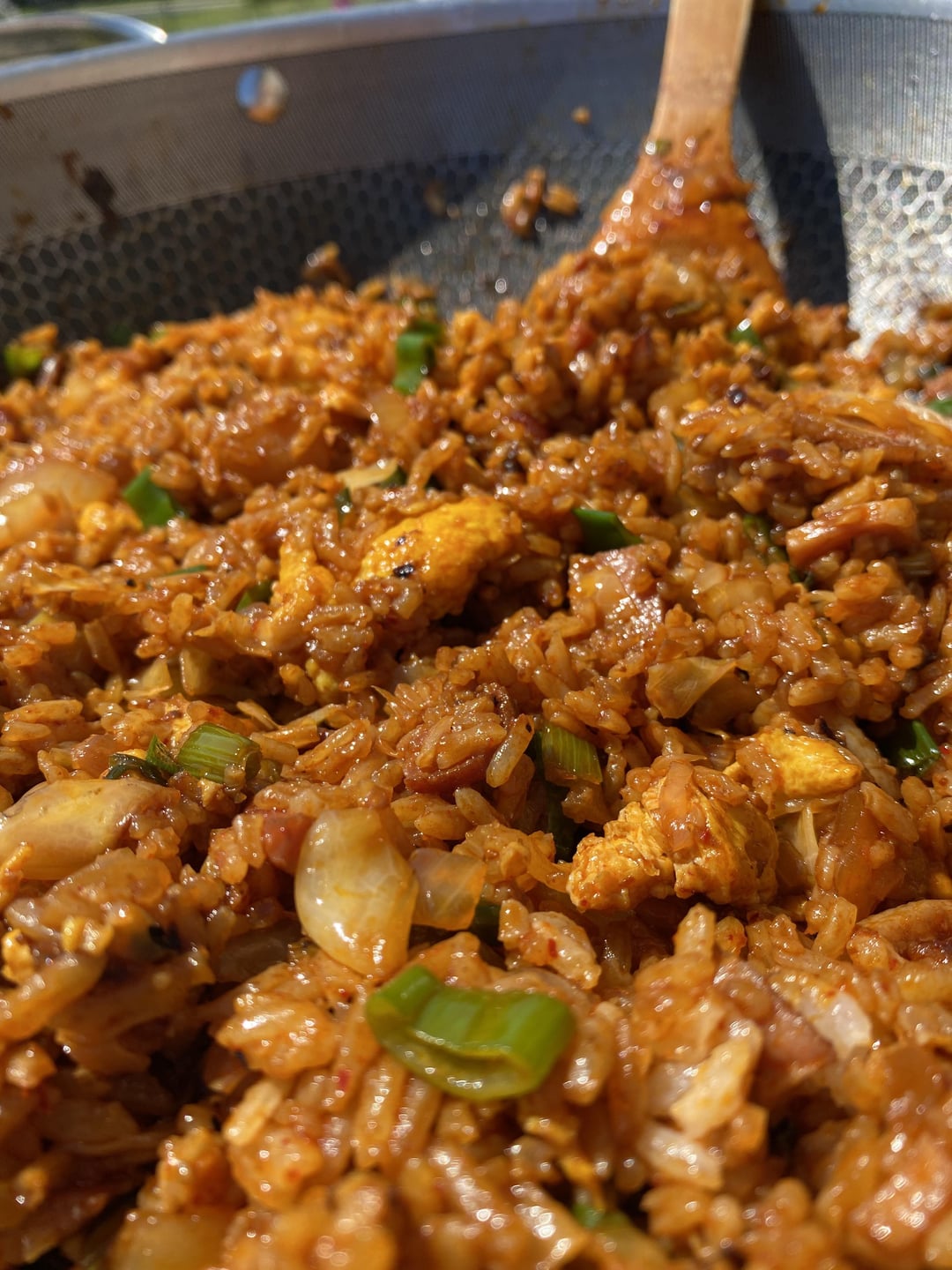 Instead of medium grain sushi rice, I used jasmine rice. I used kimchi, onions, cabbage, spring onion, and bacon and like many have suggested, I made some scrambled eggs to throw in towards the end.