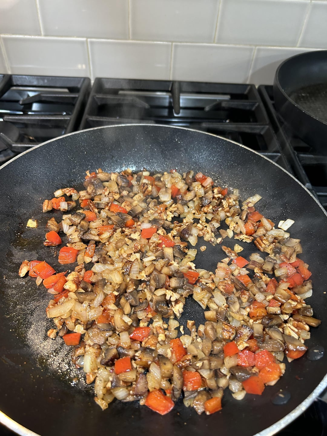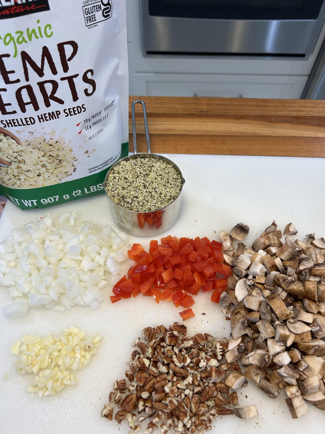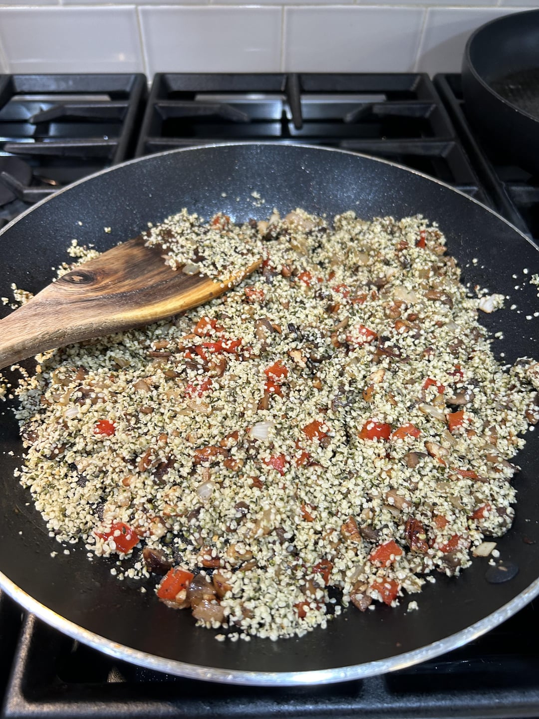 Dice mushrooms, onion, red bell pepper, pecans (or almonds, or even pine nuts). Sauté the mushrooms in butter, adding the other veg to the skillet, sauteeing until soft. Add a cup or less of hemp seed hearts and some chopped pecans, stirring a bit before adding a few ounces of chicken stock, seasoning to taste as you go. Let it lightly simmer until most of the liquid is gone. Taste again for seasoning, et voila!